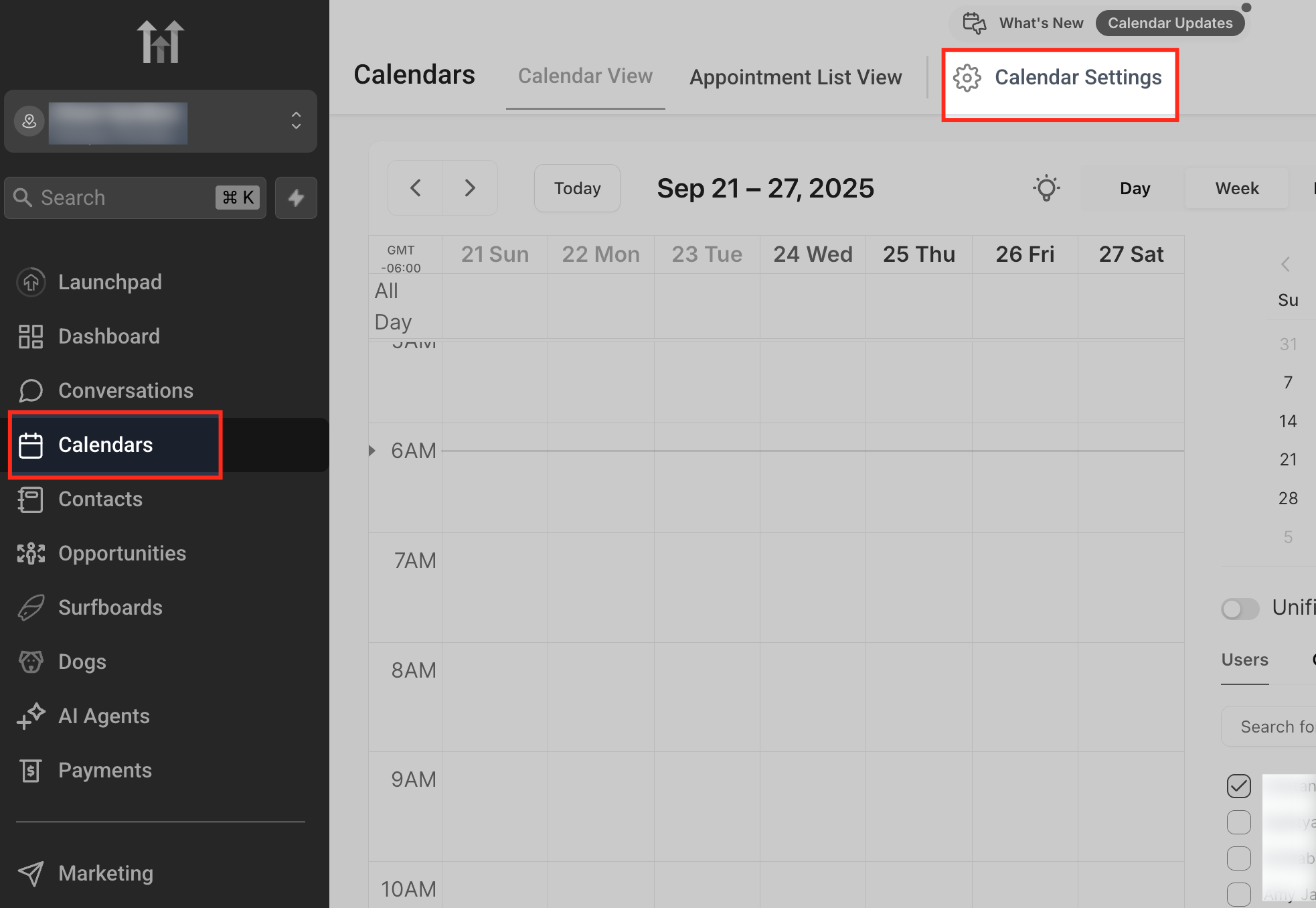 From the Calendars menu, click on Calendar Settings at the top-right corner. This is where you access all configuration options for groups, services, and preferences.