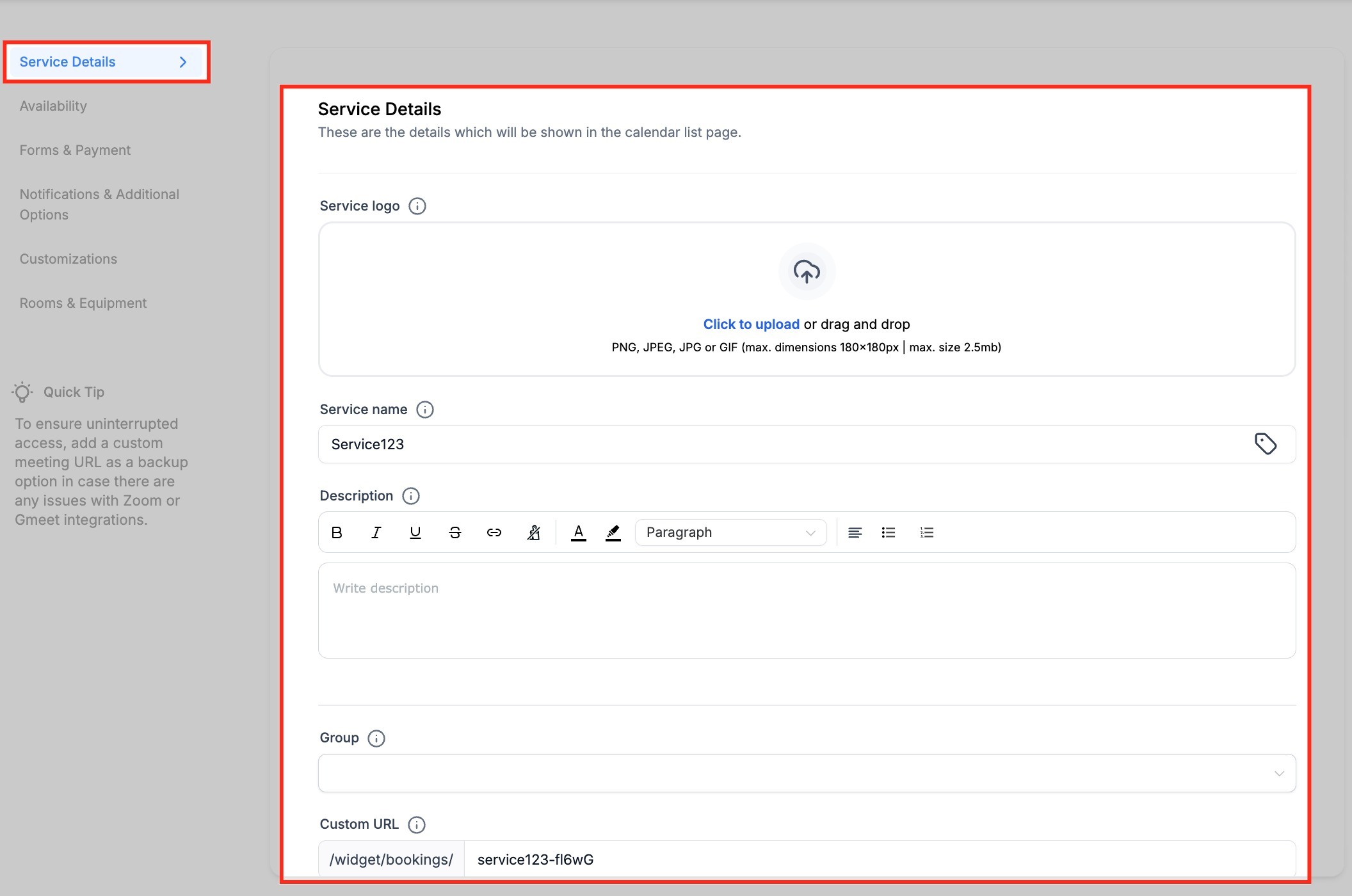 In the Service Details tab, you define the information that customers will see when booking this service. Start by uploading a Service Logo to give the booking page a professional look. Enter a clear Service Name (e.g., Haircut, Beard Trim, Shave) and add a Description that explains what the service includes, such as “30-minute haircut with wash and style.”