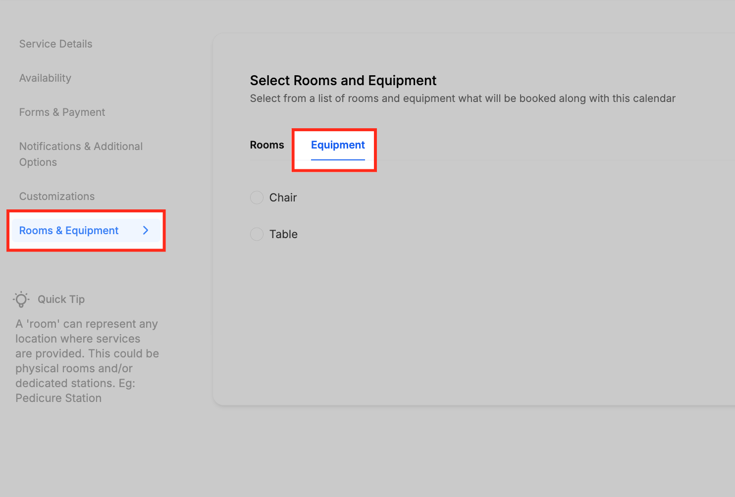 In the Equipment tab, you link the tools or resources needed to complete the service. Equipment can represent items like razors, shears, or hair dryers, and you can specify the available quantity. For example, you may assign “Razors” to a shave service or “Hair Dryer” to a styling service. When a customer books the service, the system automatically reserves the necessary equipment, making sure it isn’t overbooked across multiple appointments. This helps maintain smooth operations by guaranteeing that all required tools are available for every appointment.