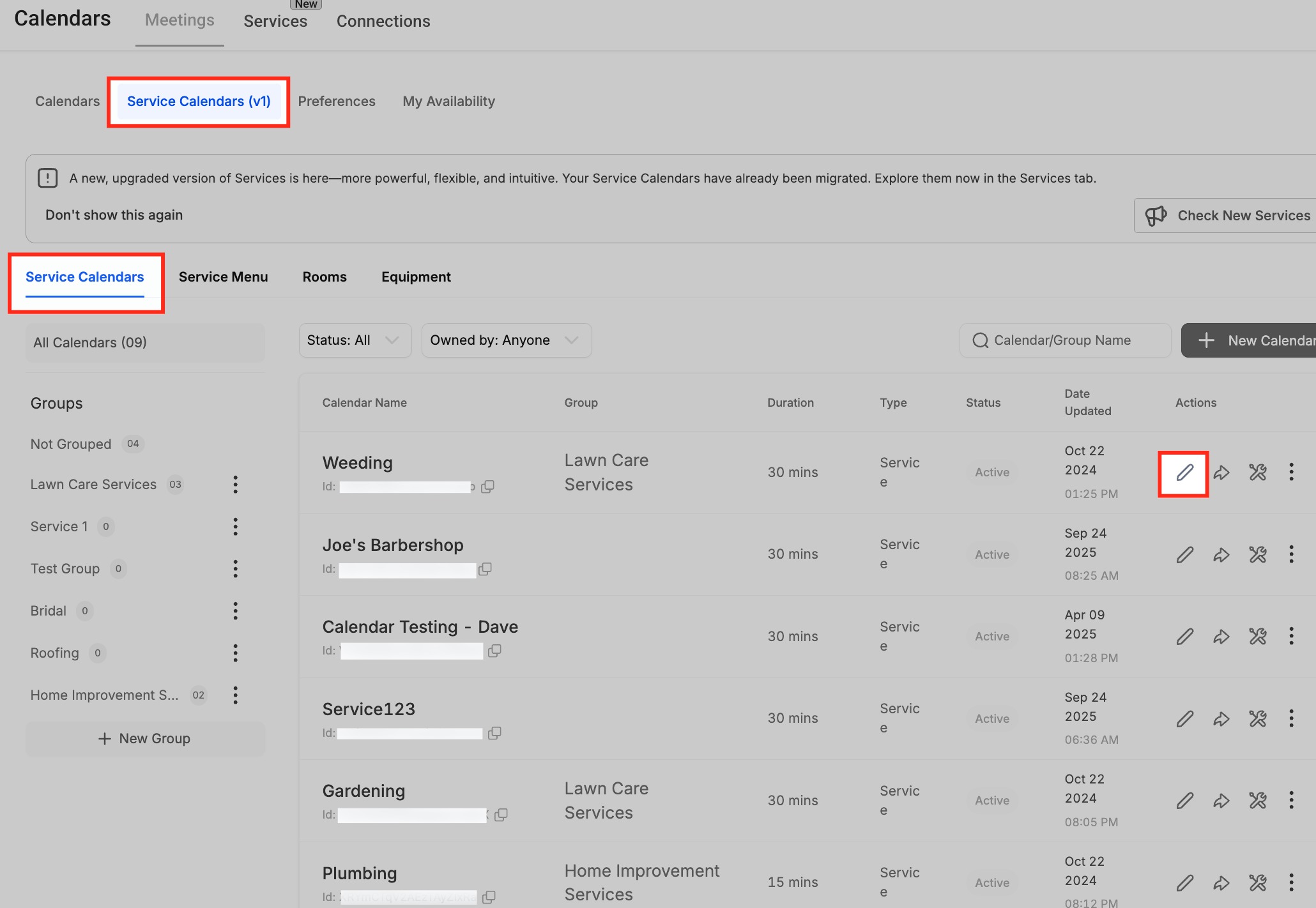 To update an existing service calendar, go to Service Calendars (v1) under the Meetings tab. Find the calendar you want to edit from the list and click the pencil icon under the Actions column. This will reopen the calendar settings, allowing you to adjust details such as service name, assigned staff, availability, notifications, or resources without having to recreate the calendar.