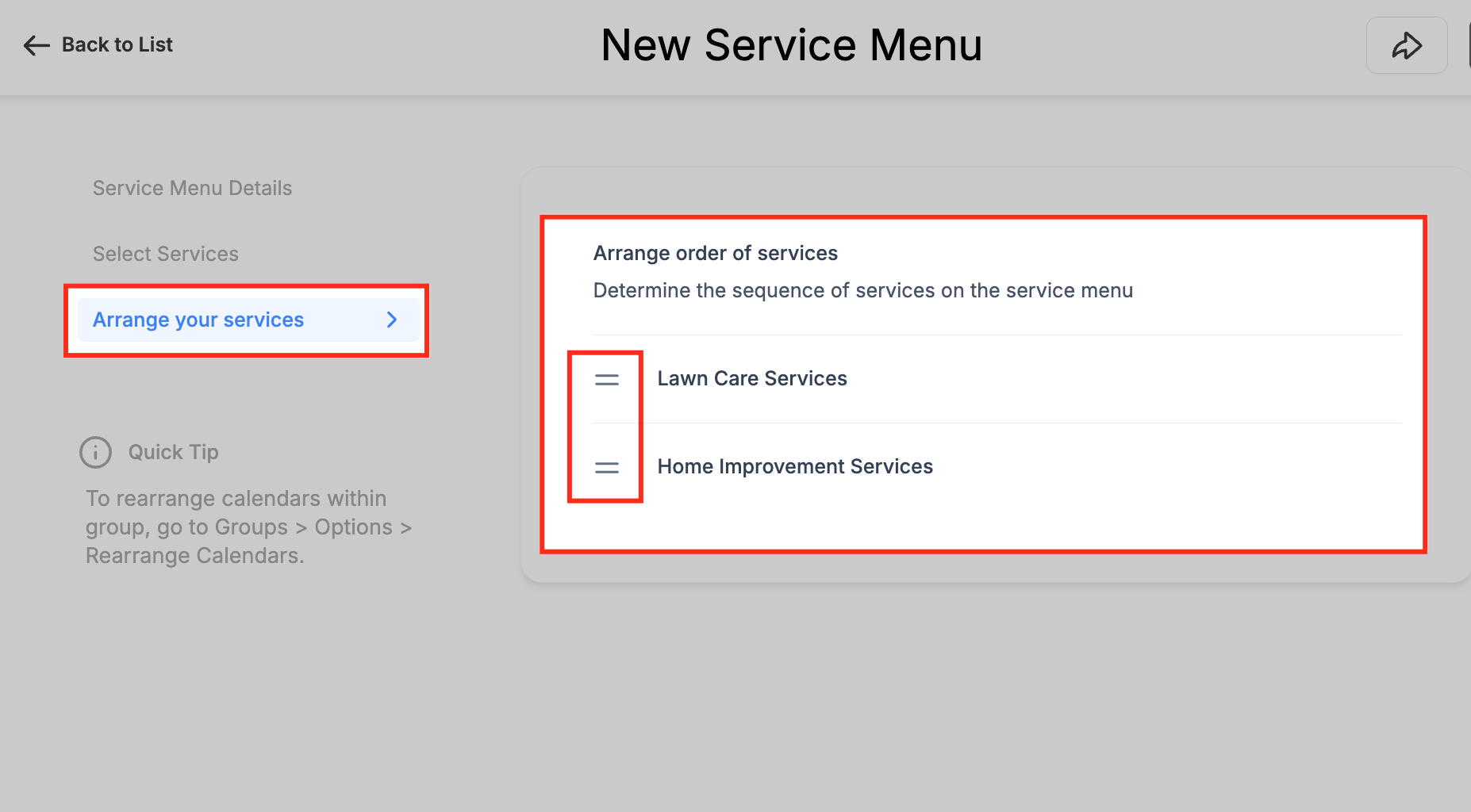 Open Arrange your services, then drag the handles to reorder how groups/services appear. Place your most popular items (e.g., Haircut, Shave) at the top to improve conversions.
