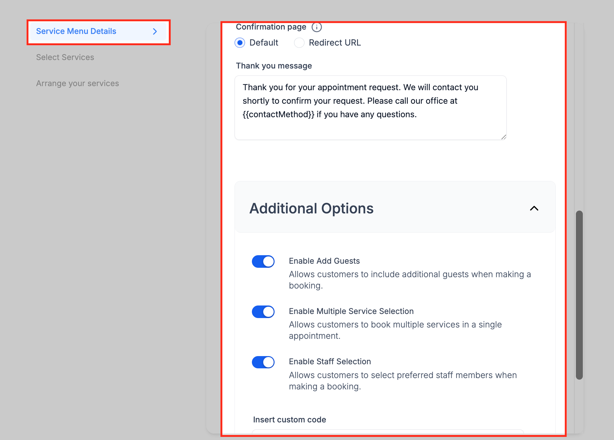 The Service Menu lets you display multiple services or groups in a single booking page.