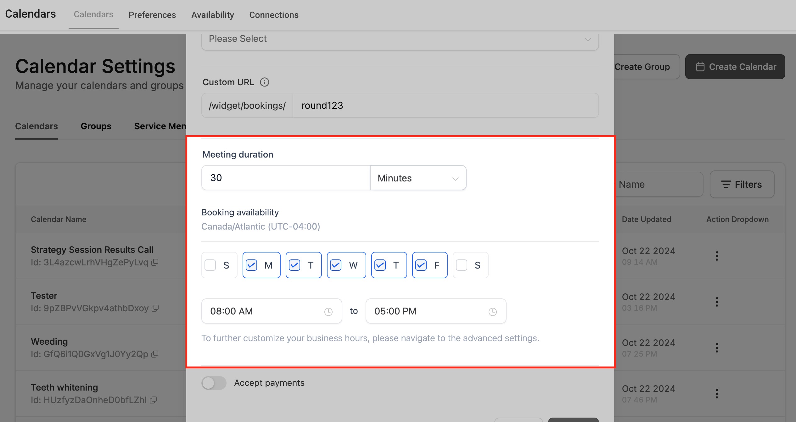 For detailed steps on customizing availability, refer to Collecting Payments in Calendars