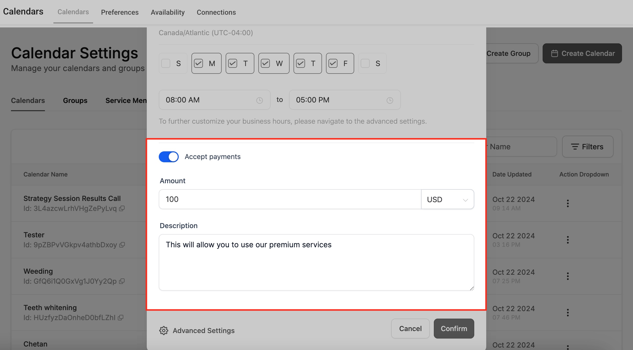 Step 6: Accept Payments: The Accept Payments tab allows you to enable payments directly through your calendar. If your services or products require payment, you can toggle this option to accept payments seamlessly during the booking process.