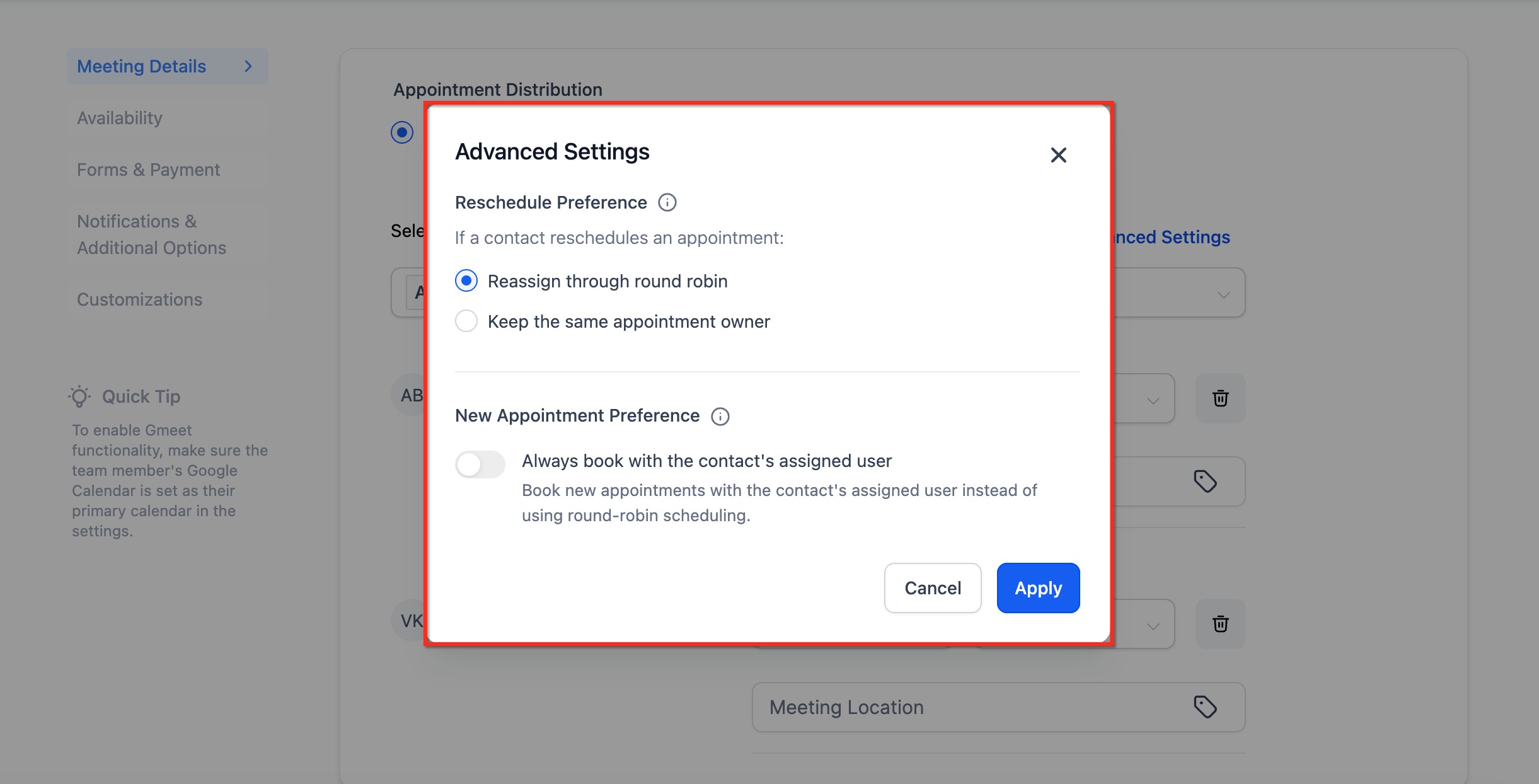 - Go to Meeting Details > Team Members > Advanced Settings and toggle Always Book with Assigned User to enable this feature.