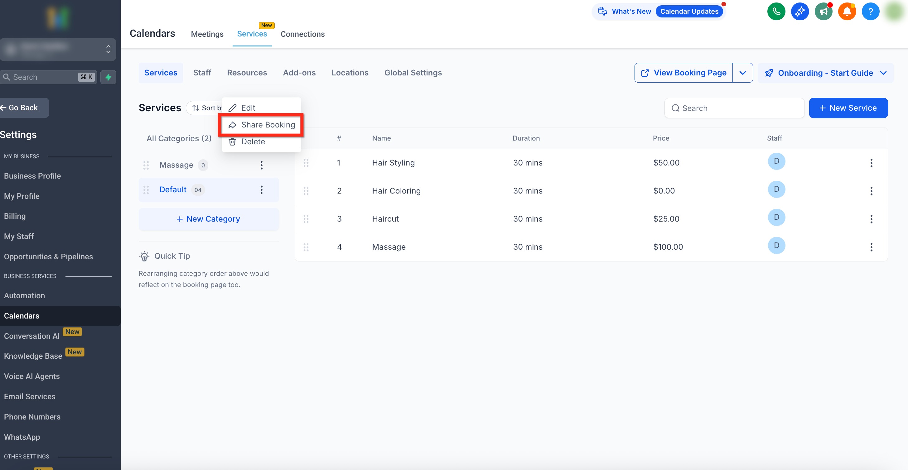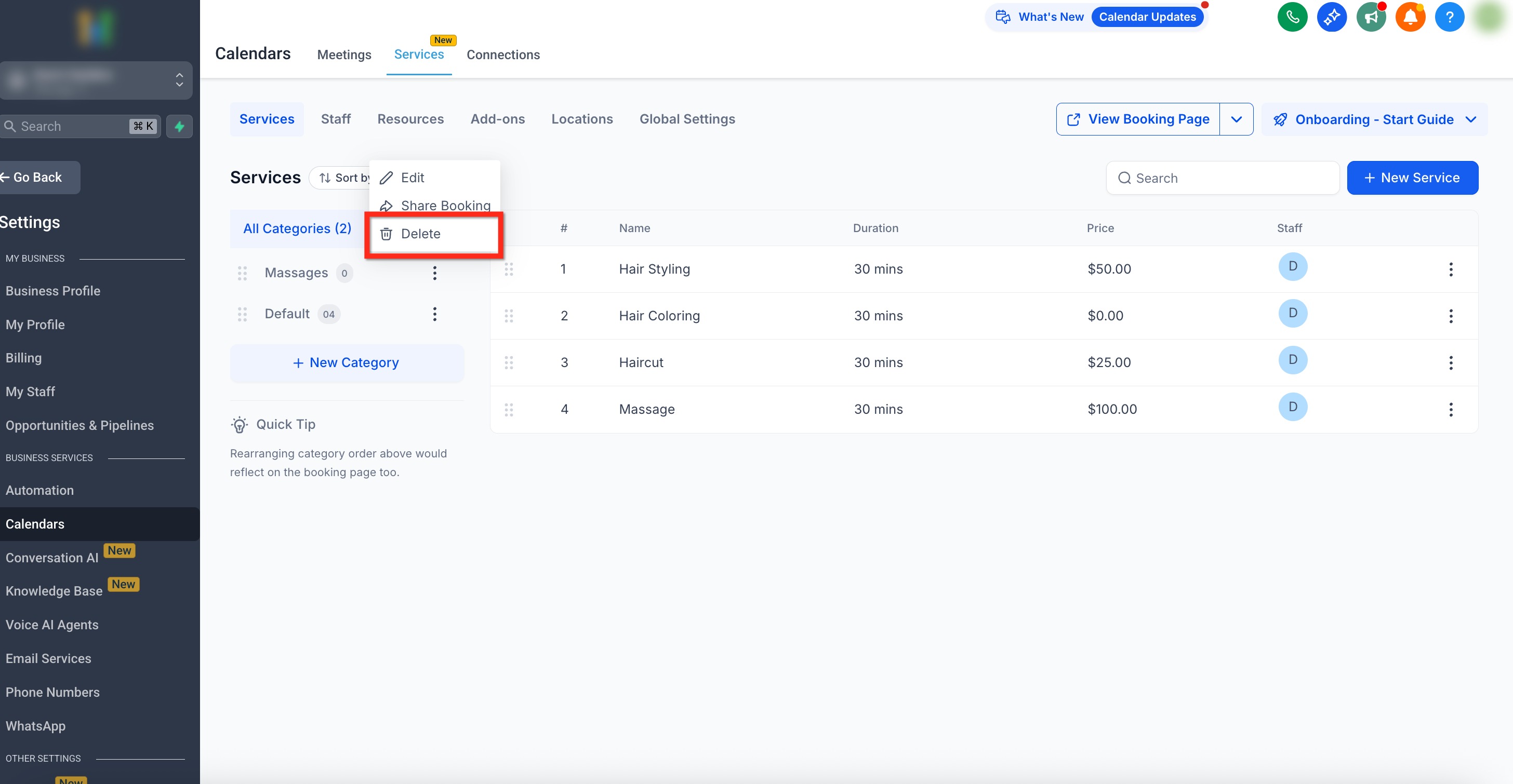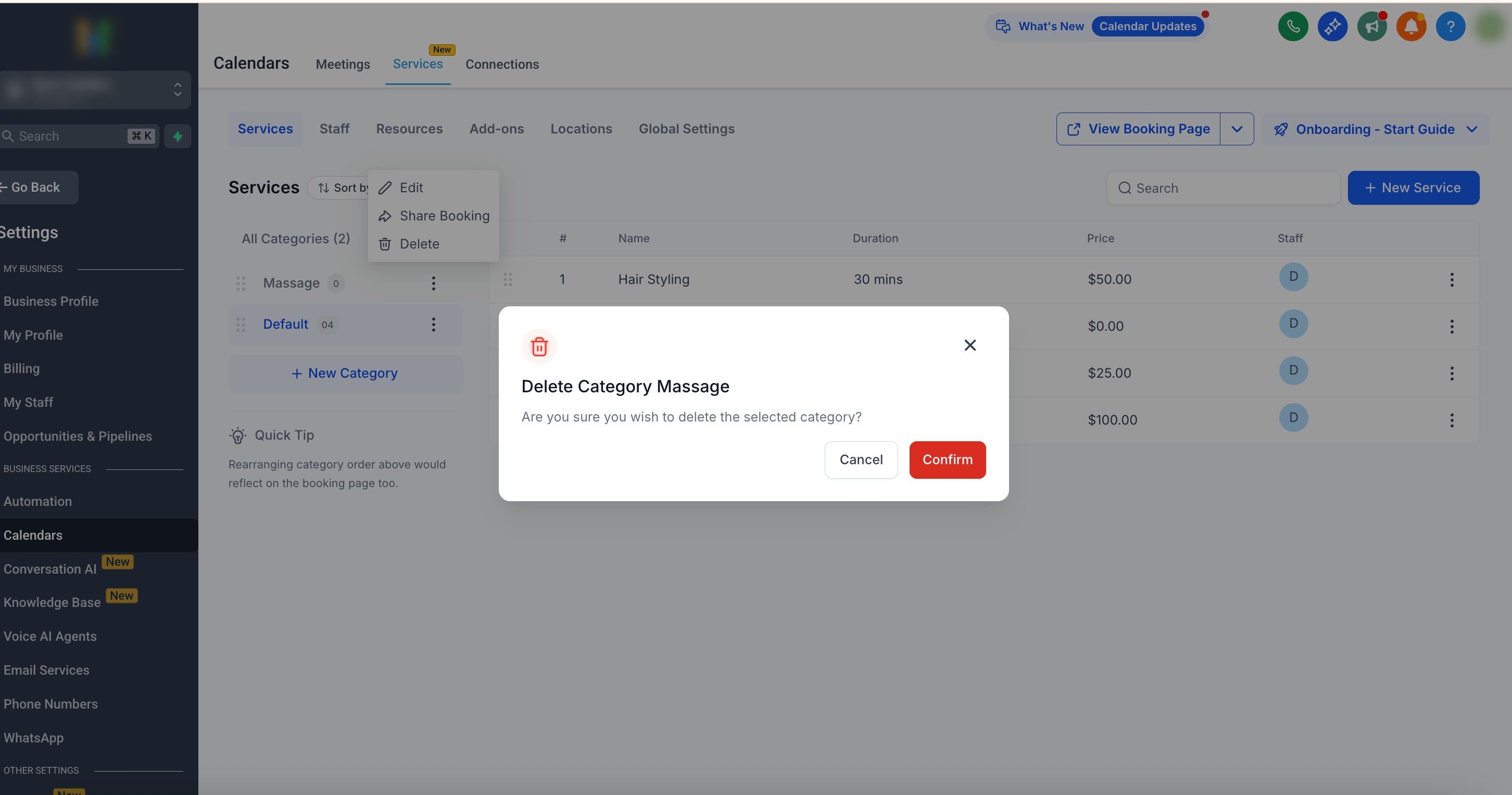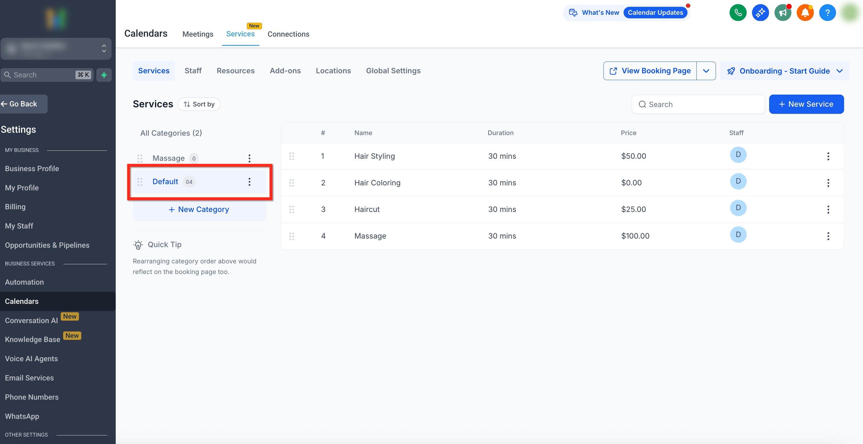 - If a category is deleted, all its services will be moved into the Default Category to ensure they remain bookable.