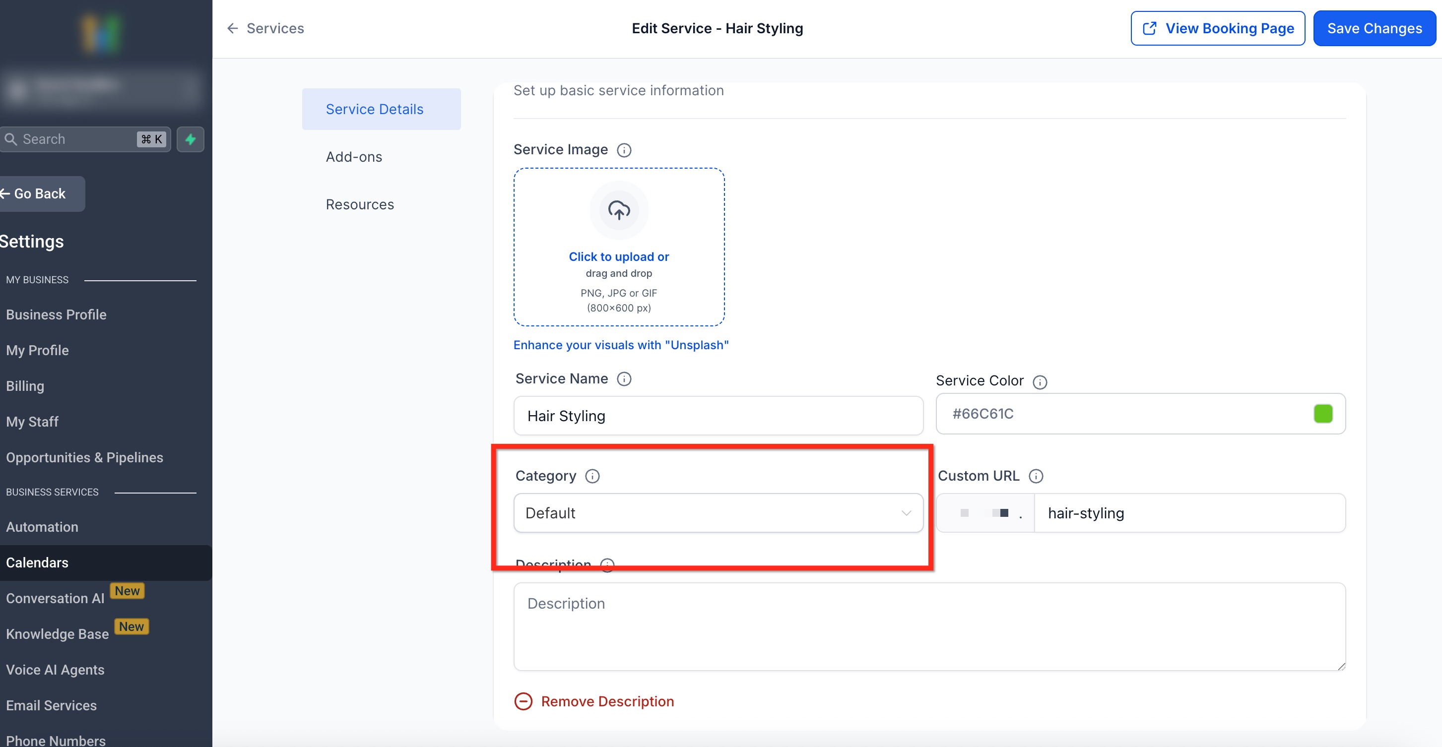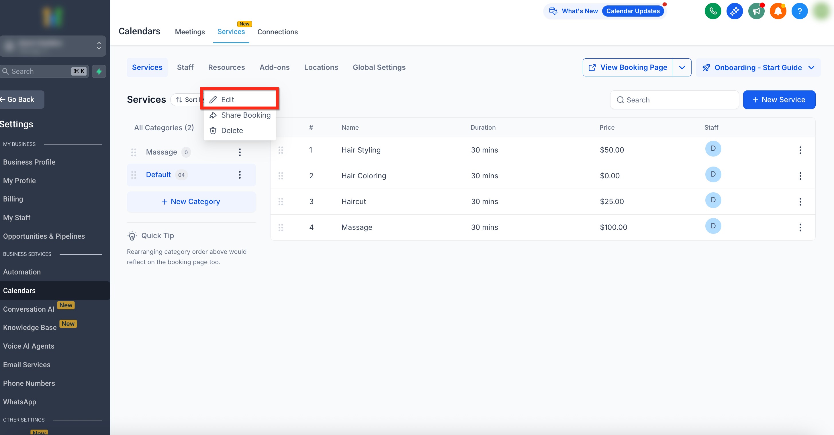 Place each service under the right category so it appears in the correct section on your public booking page. Unassigned services live in the Default Category, and services from a deleted category are moved there automatically. You can reassign them whenever needed.