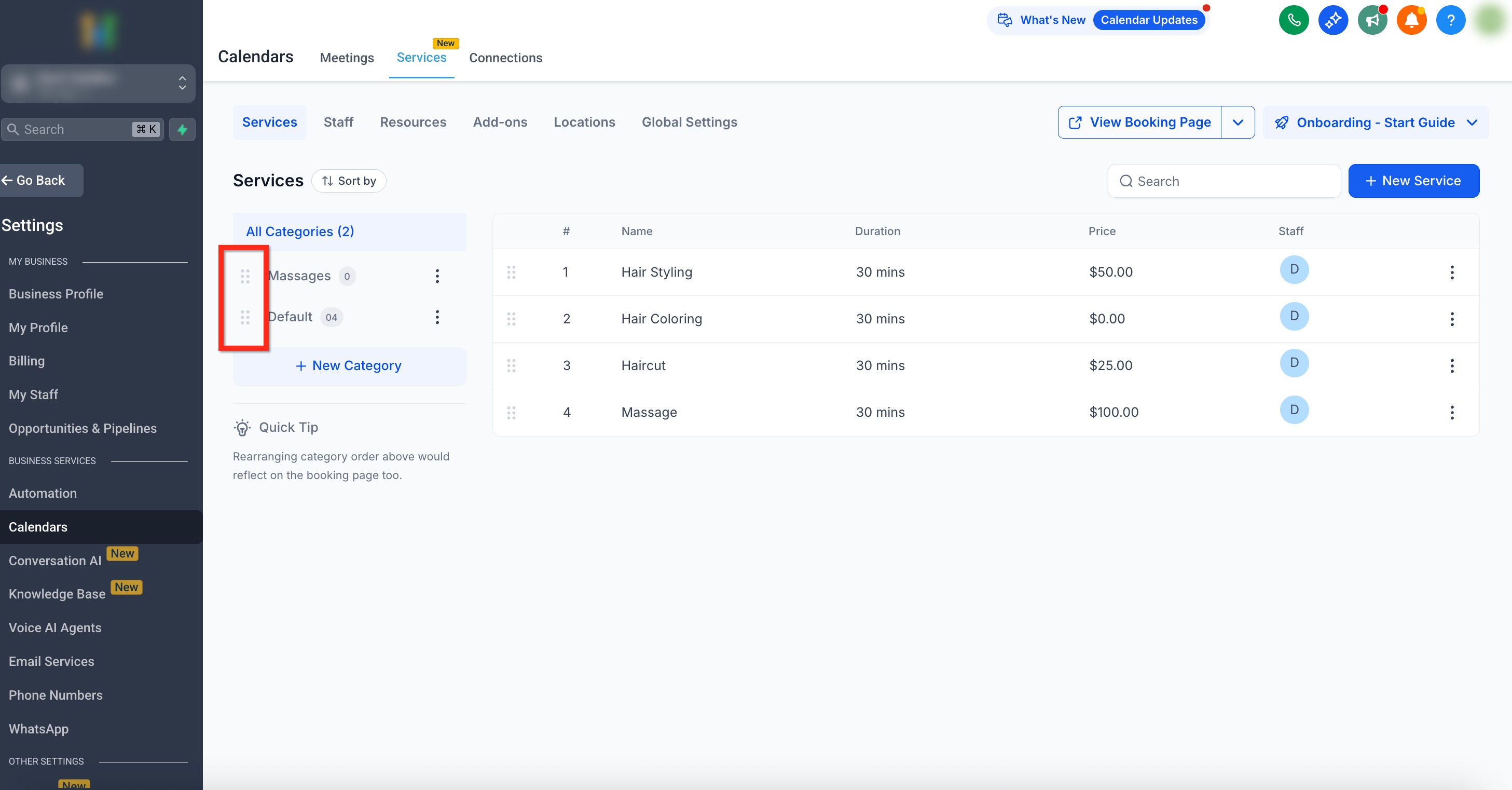 Categories are used to group similar or related services, making it easier for customers to navigate your offerings. Categories appear on your booking page as organized sections, with each service listed under its assigned category.