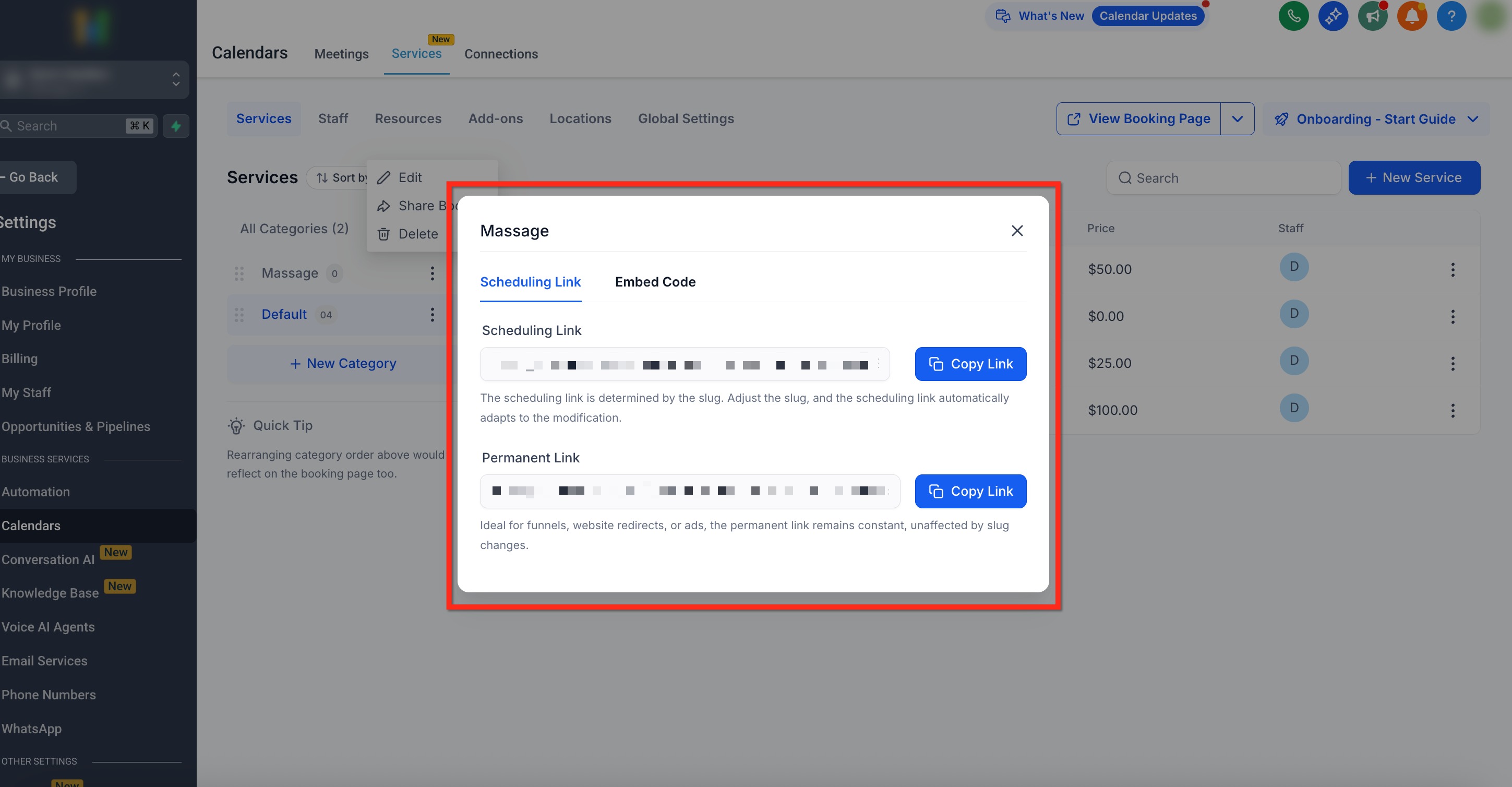 Yes. Enable Services for the sub‑account to access the Services panel, create categories, and share booking links. You can enable Services for one or multiple sub‑accounts from the Agency view.