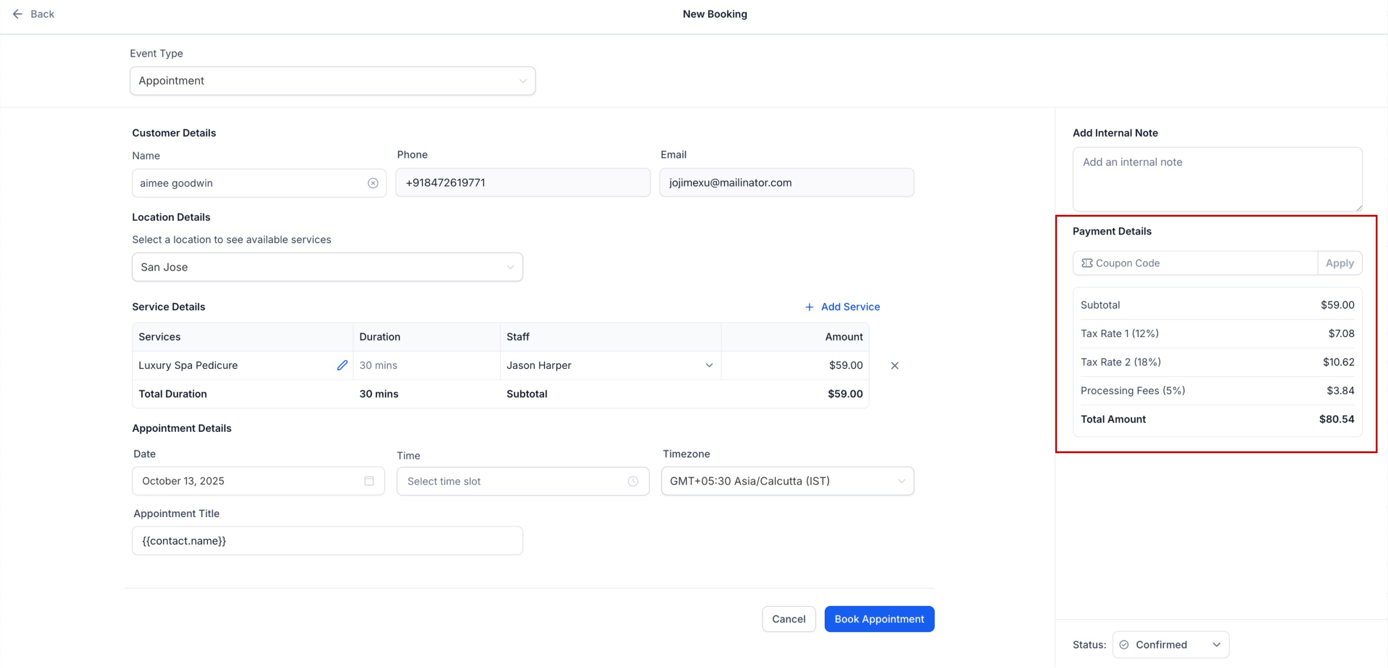 Knowing where fees and taxes appear helps teams verify totals and answer customer questions. The same totals carry into the appointment record for internal clarity and reporting.