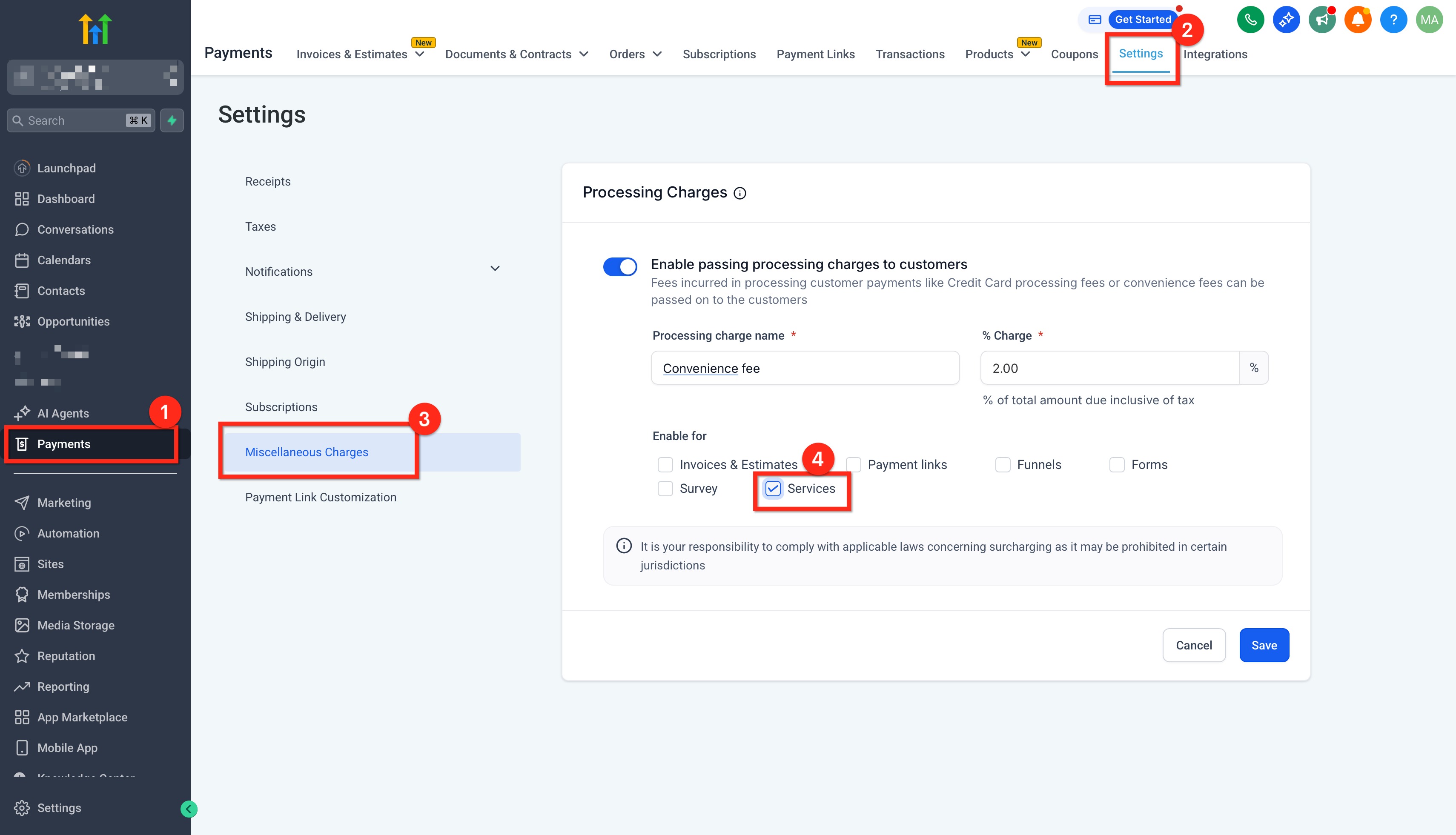(Optional) Add a Processing/Miscellaneous Fee on the Service → enter a percentage and a custom label.