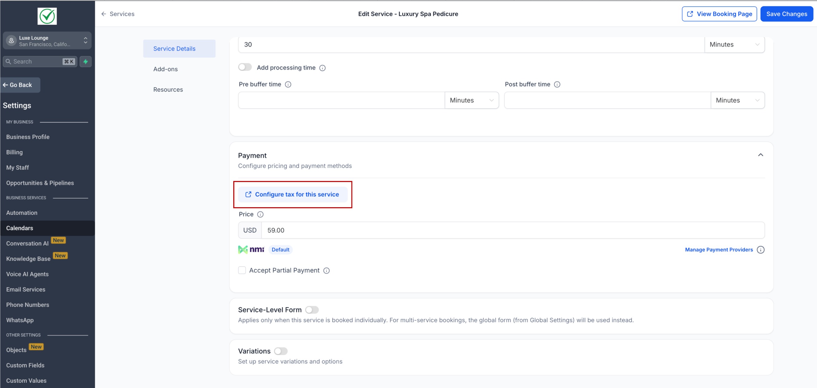 Payments section → click Configure Taxes for This Service.