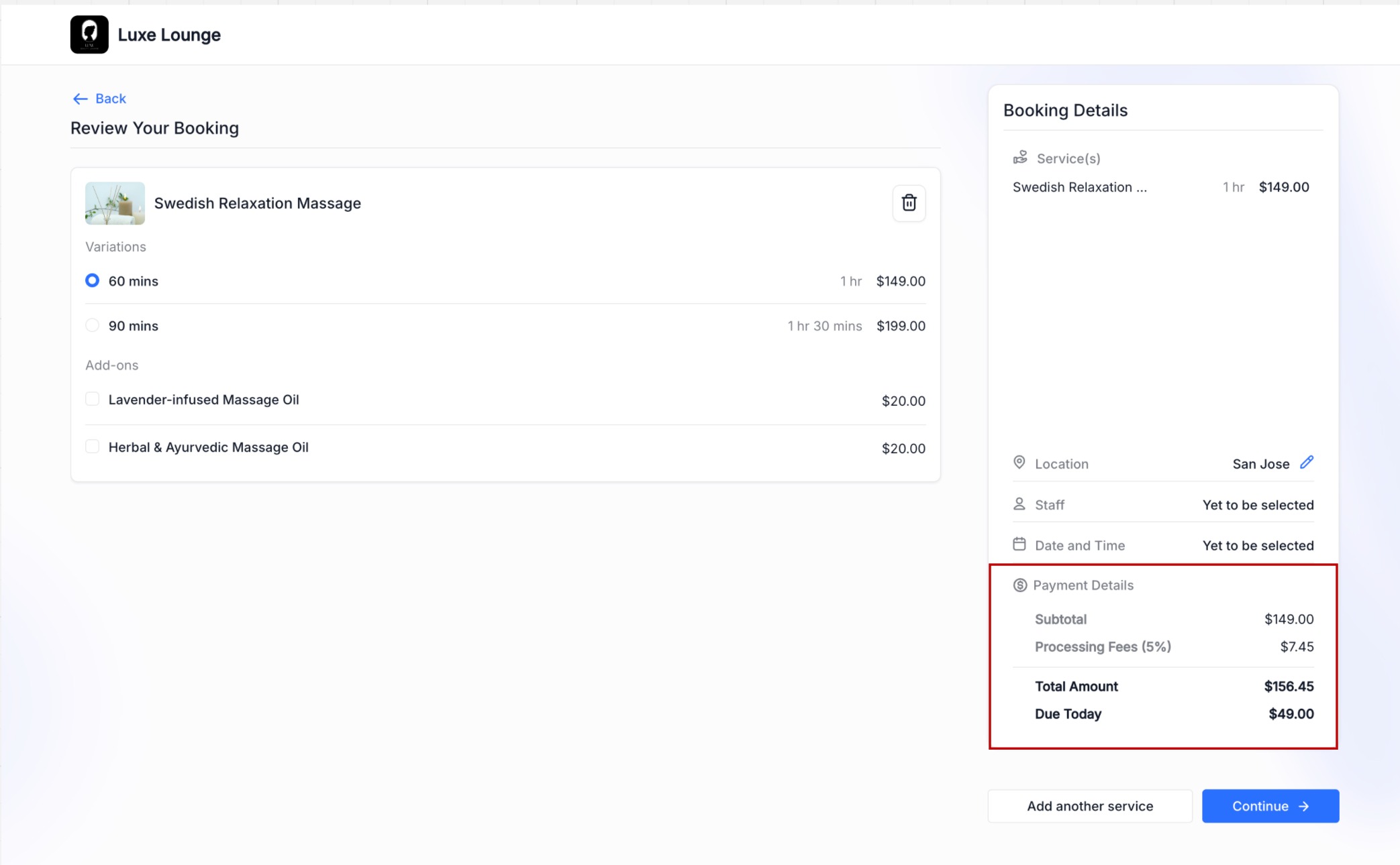 Save the Service. Future bookings will itemize the fee and tax lines automatically on the booking page, appointment record, and receipt.