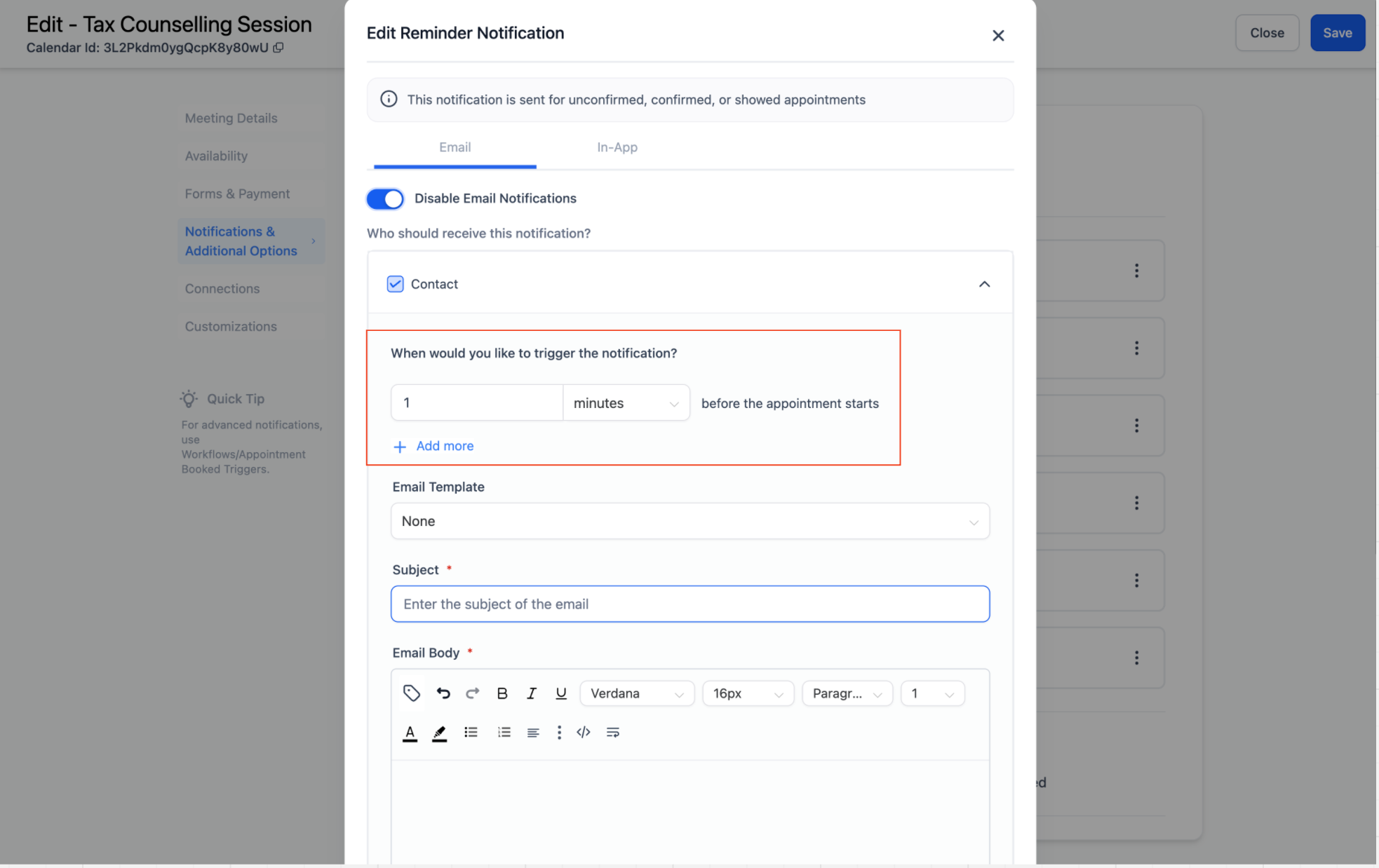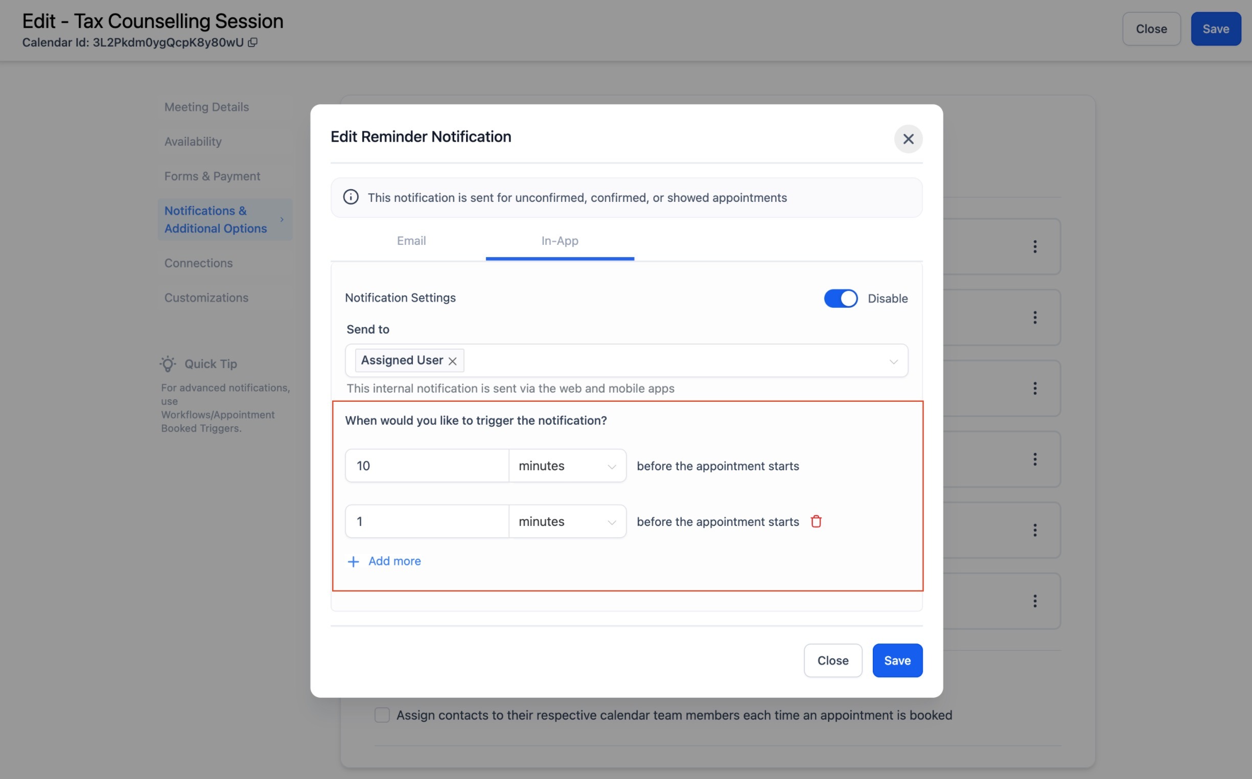 - Reminders: Specify how far in advance the notification should be sent before the appointment.