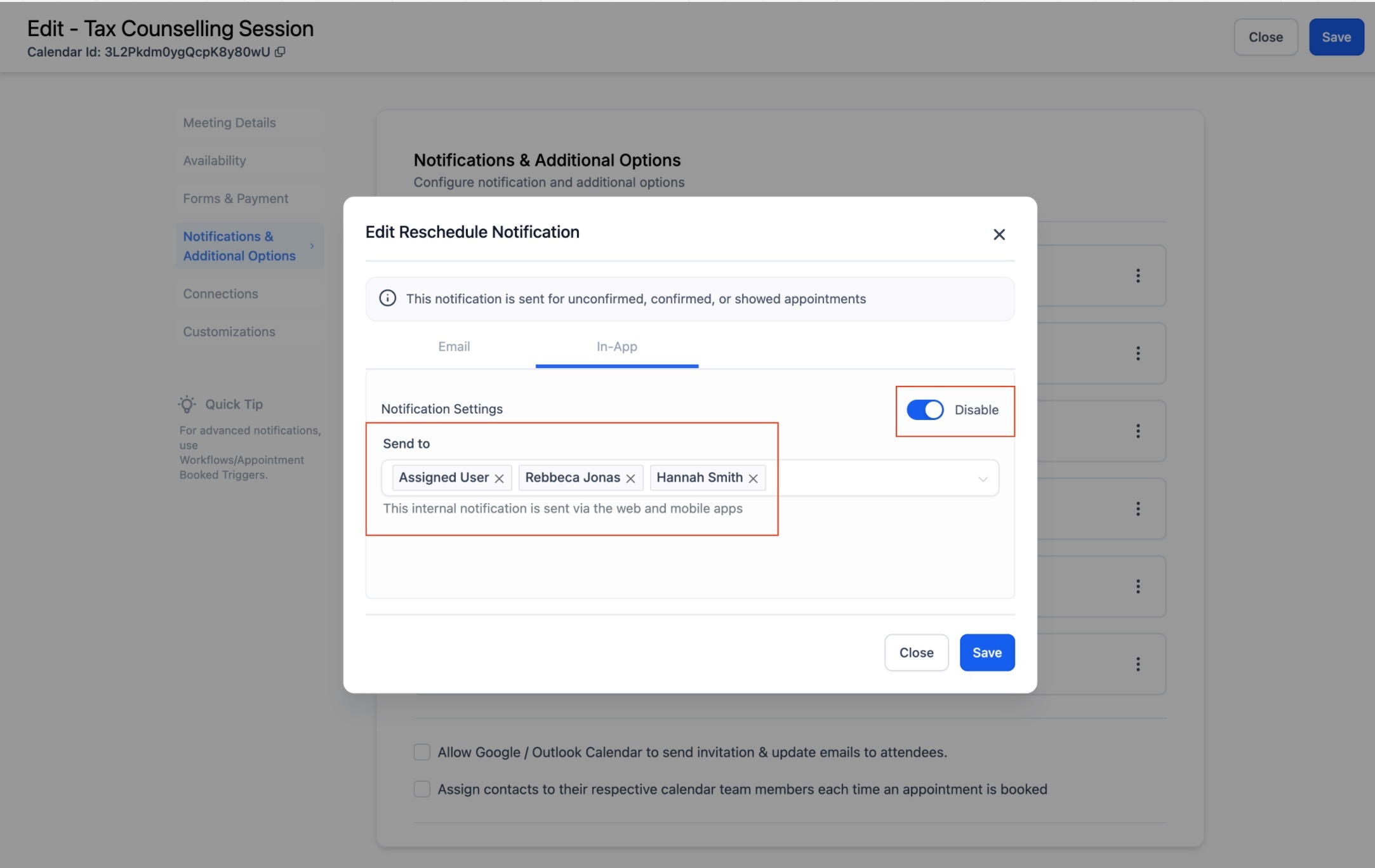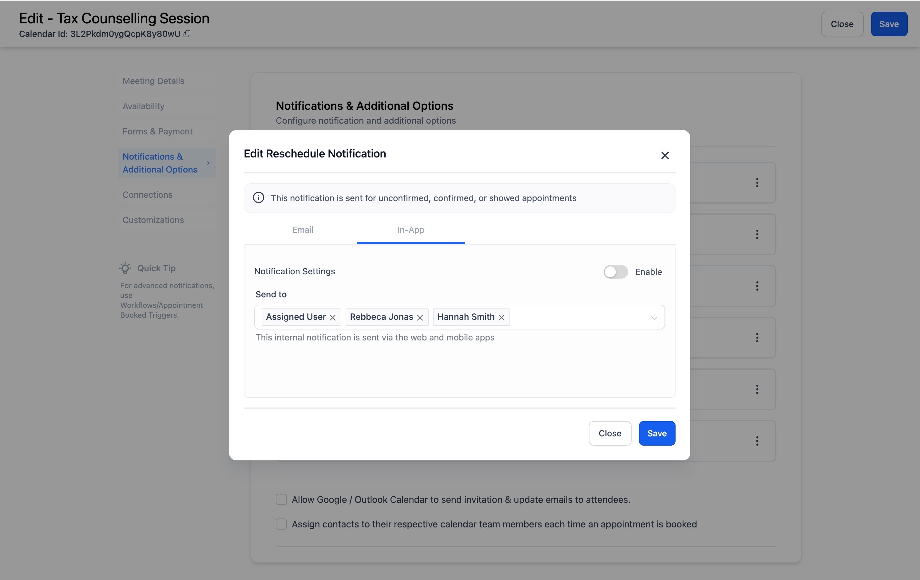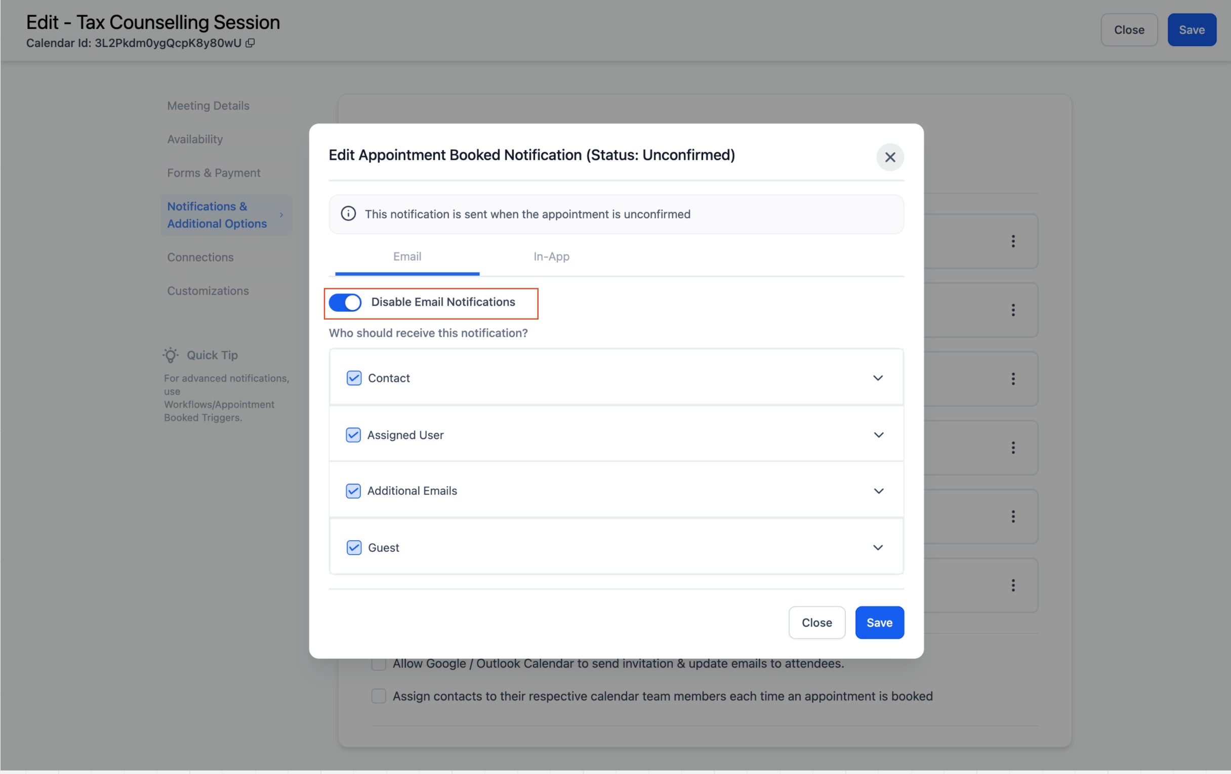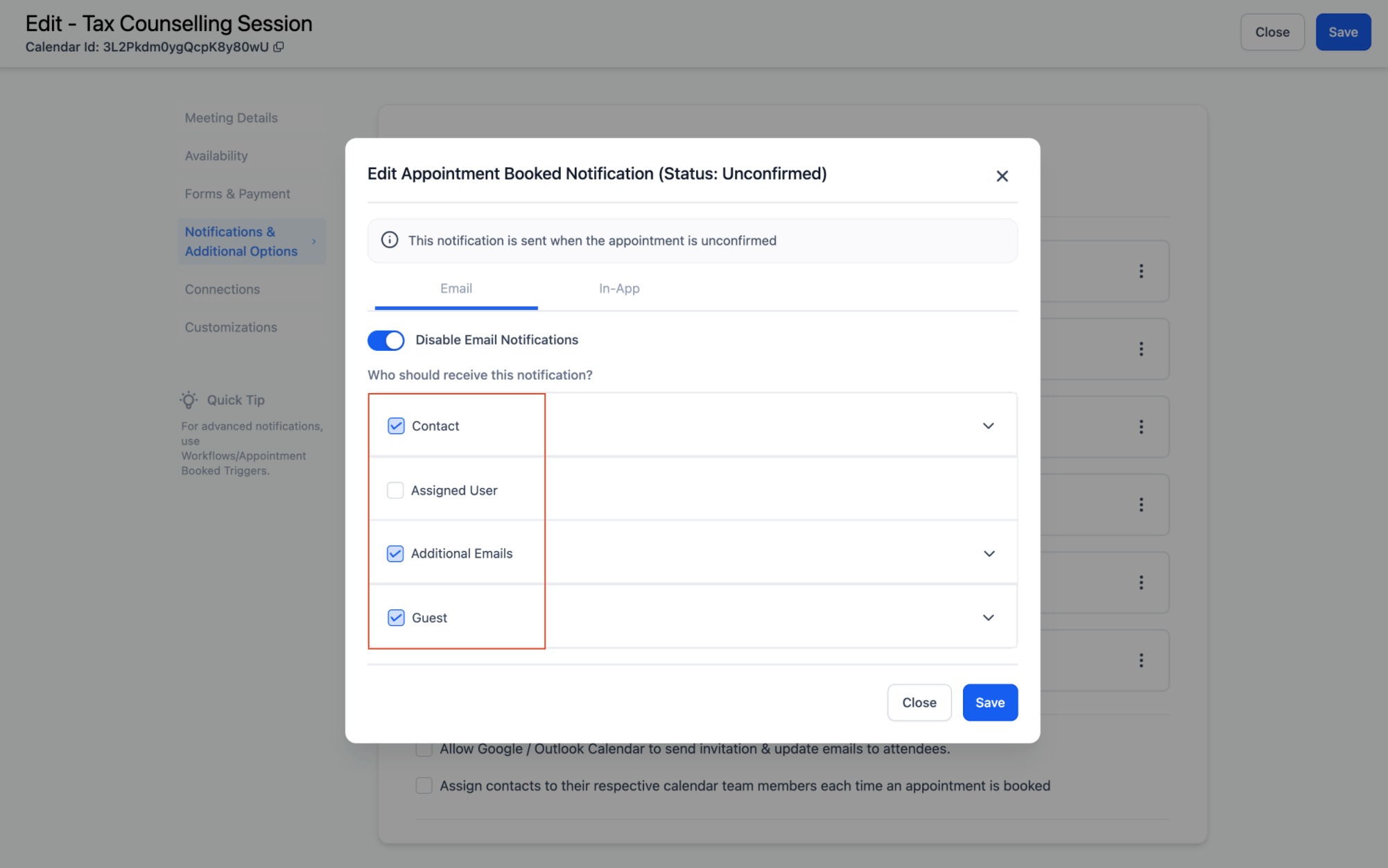 With customizable calendar notifications, you can send In-App and tailored emails, SMS and WhatsApp messages when appointments are booked, canceled, rescheduled, or need reminders or follow-ups. Notifications can be configured for Contacts, Guests, Users, and any additional email addresses/phone numbers you specify. This feature allows you to streamline notifications to suit your business needs, ensuring effective communication with your customers