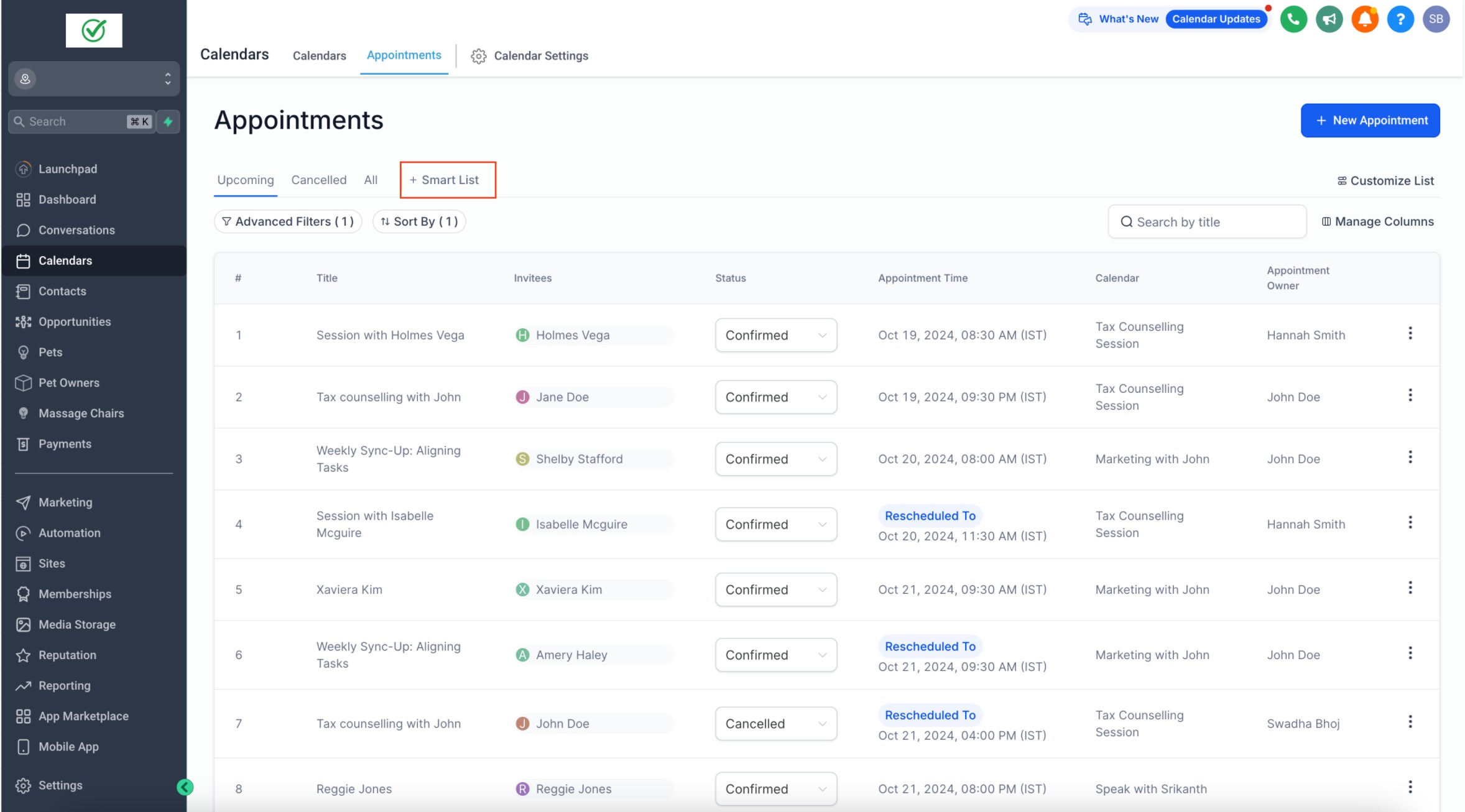 - Add Filters: Set up your desired filters to customize the appointments displayed in the Smart List.