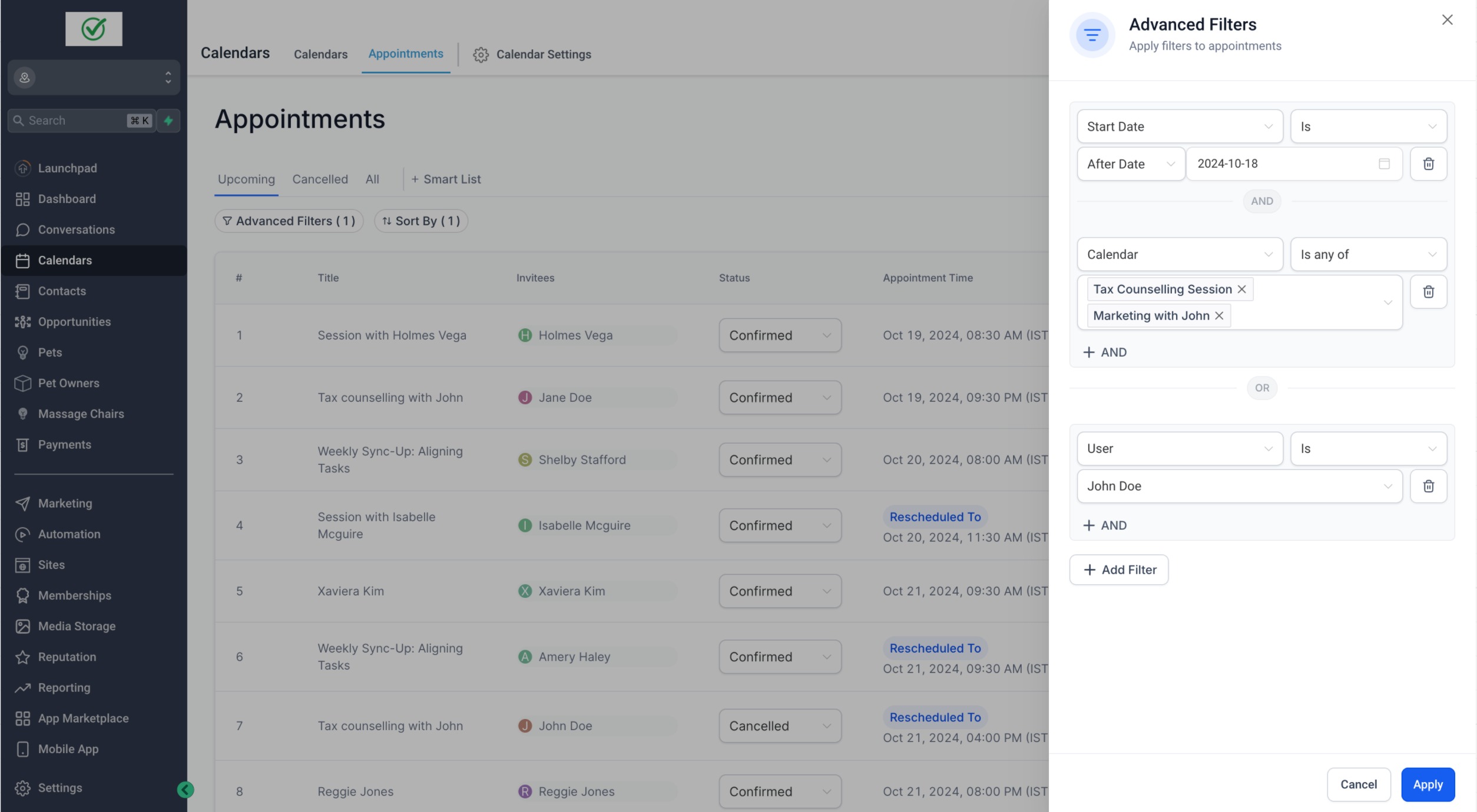 We’ve introduced advanced filtering options to make it easier to navigate and manage your appointments. These filters allow you to quickly pinpoint specific appointments based on various attributes: