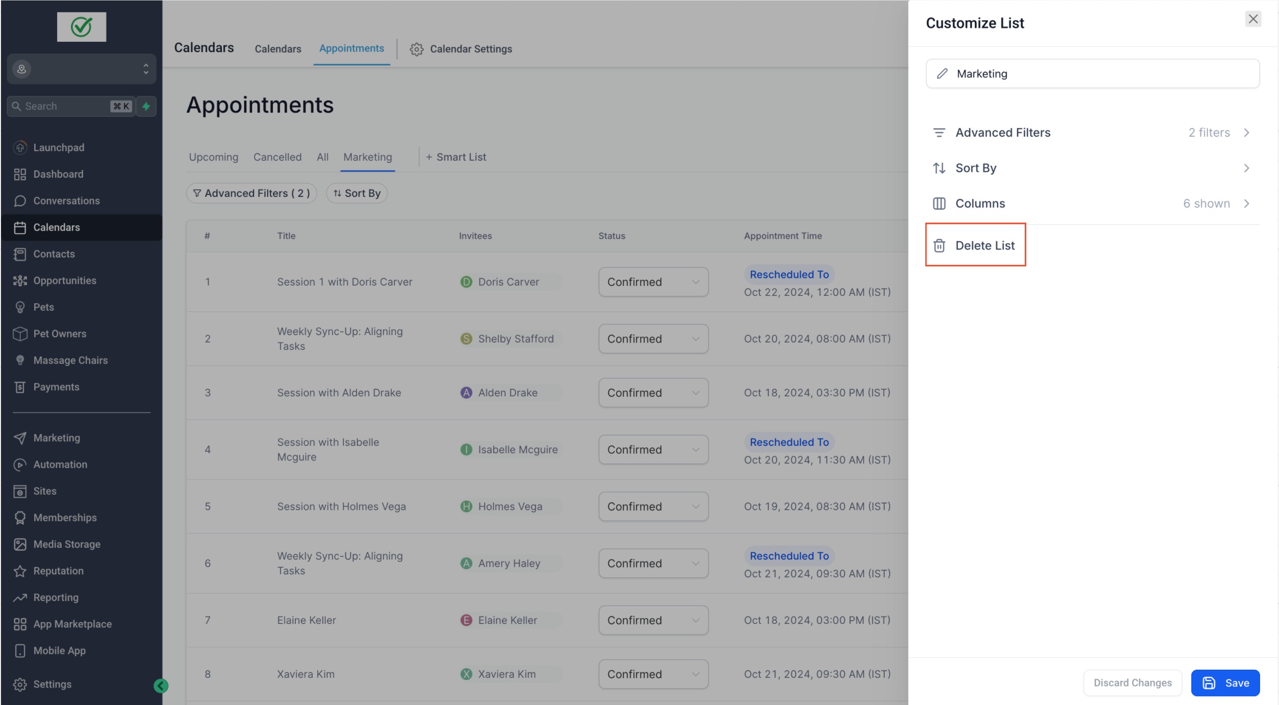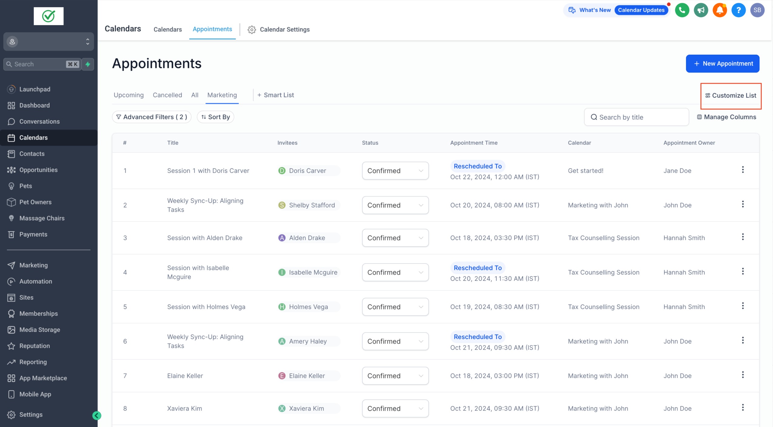 The Appointment List View provides a centralized place to view and manage all your appointments across multiple calendars. It displays all, upcoming, and cancelled appointments, allowing you to take necessary actions and stay on top of your schedule.