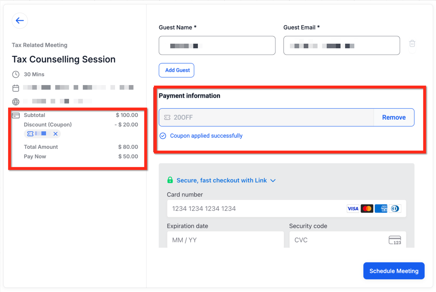 When booking via the calendar widget, customers will see a Coupon Code input box.