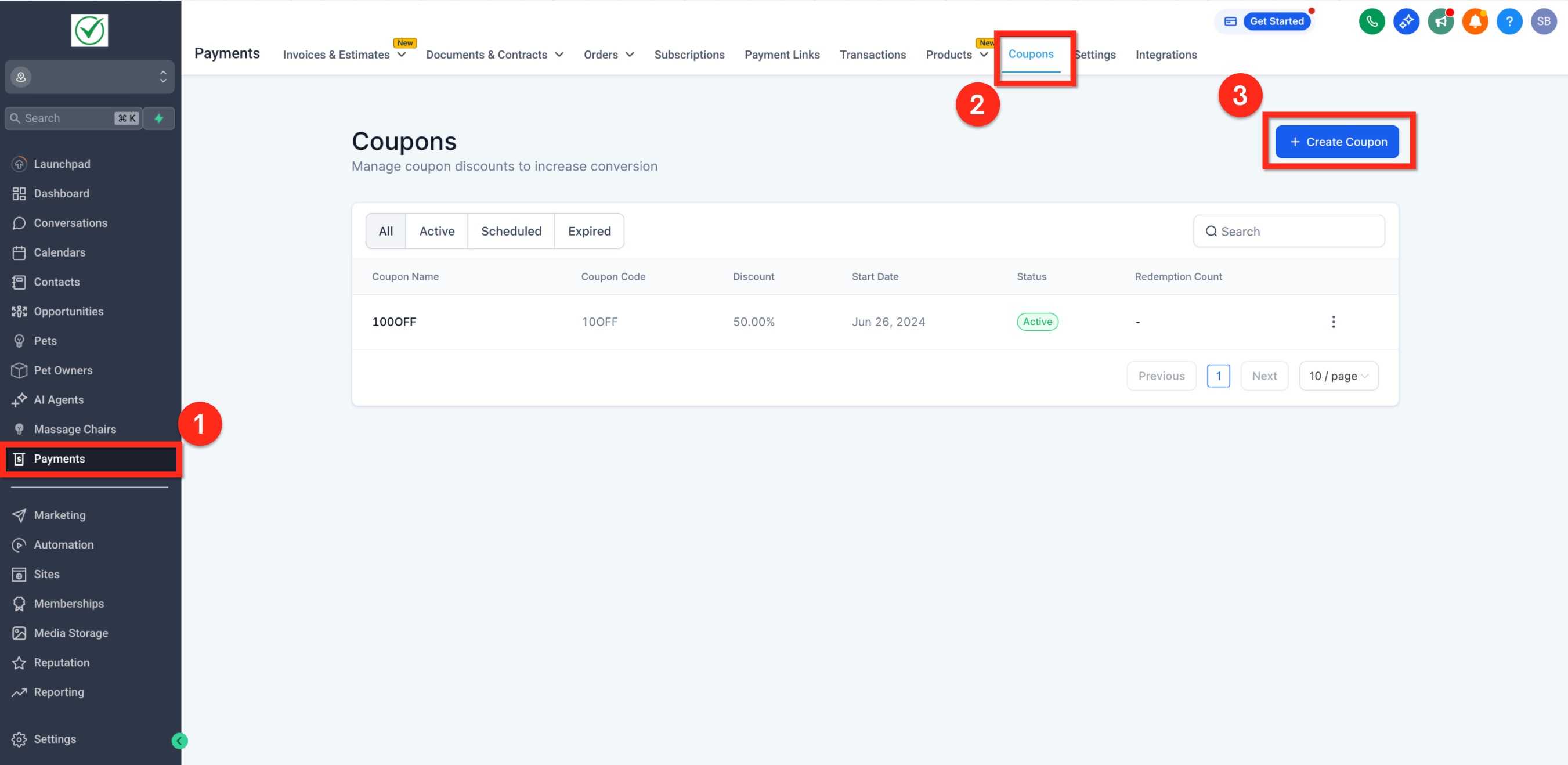 Coupon Codes allow you to offer discounts on calendar bookings made via the booking widget. Customers can enter a valid coupon at checkout to receive a discount, which is then tracked inside the Payments Tab of the Appointment Modal.