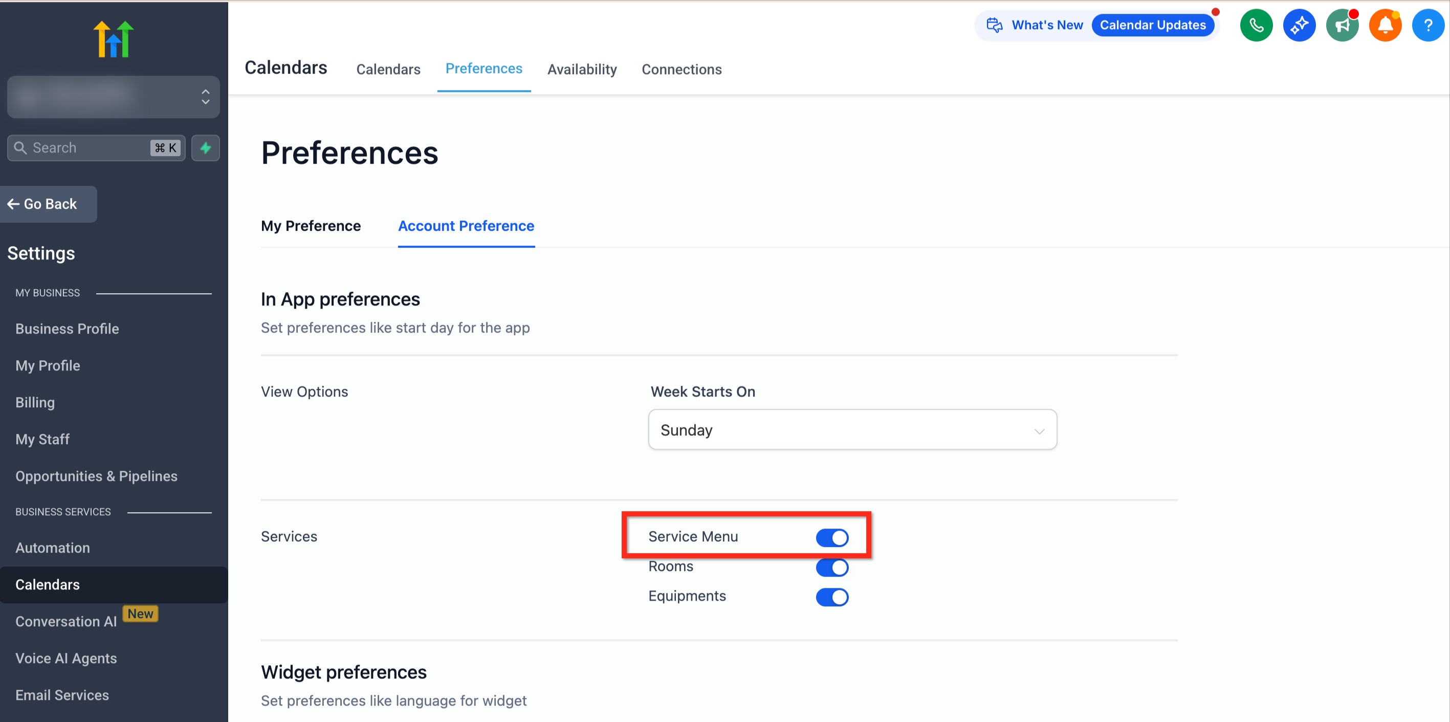 Navigate to the Service Menu tab located under Calendar Settings