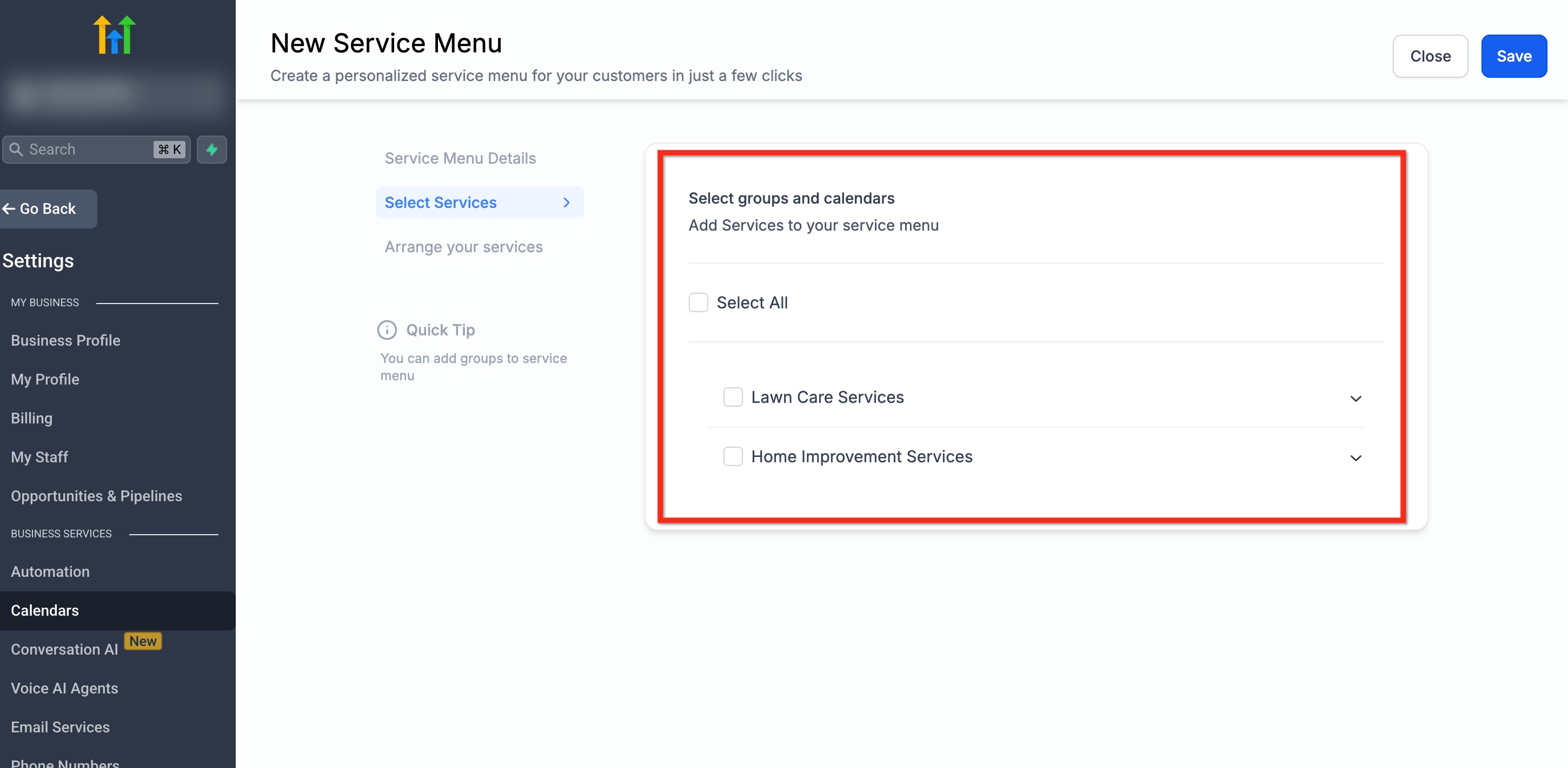 After adding details to your menu, you'll choose which services (calendars) will appear.