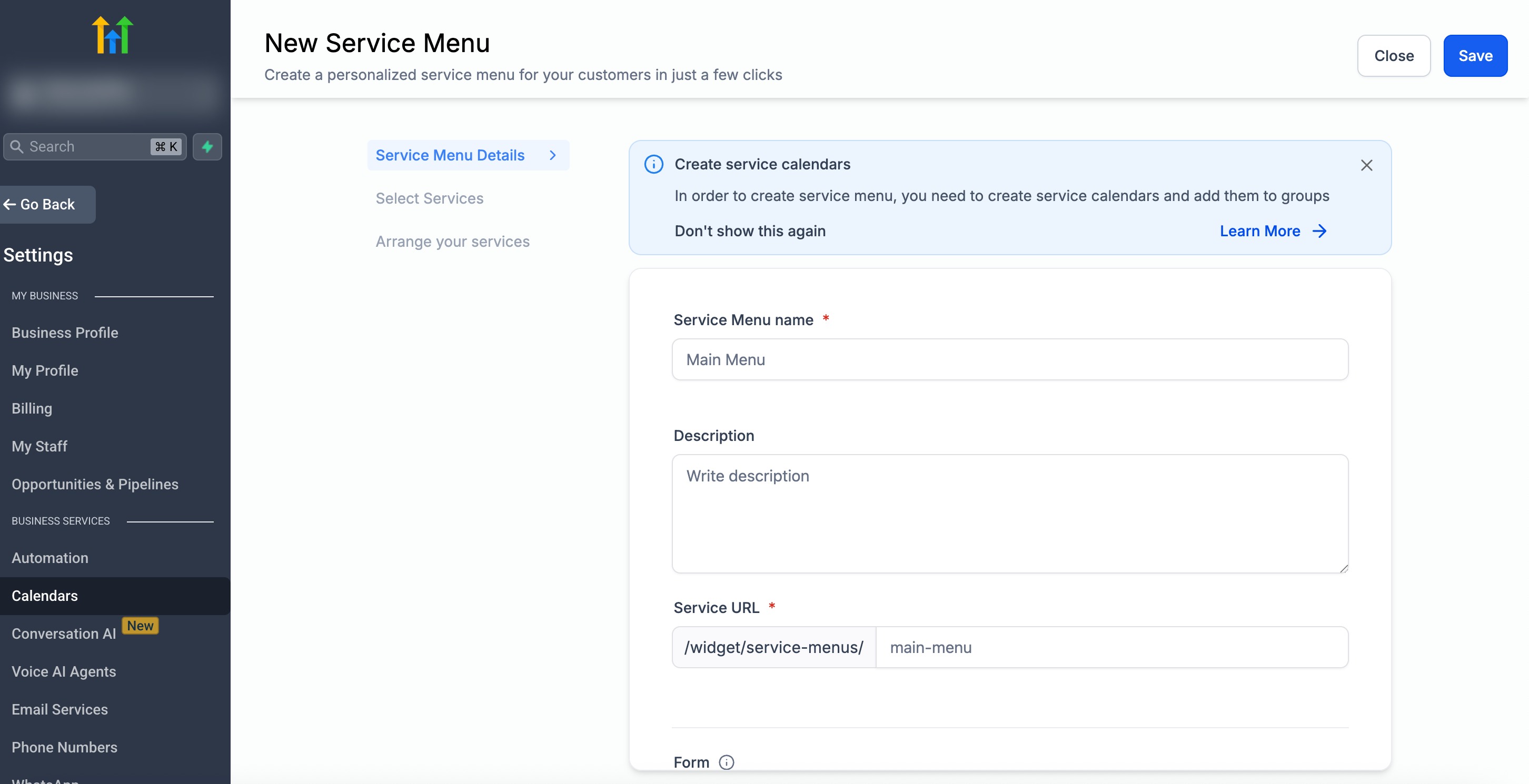 Now that the feature is enabled and your Service Calendars are ready, you can create your Service Menu.