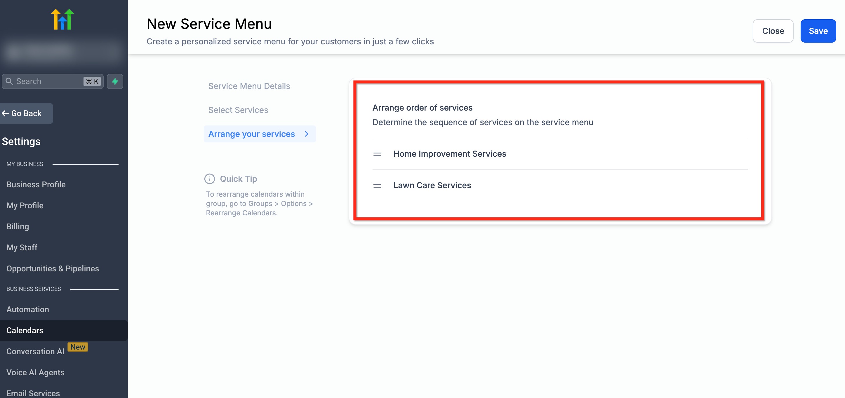 Drag and drop services while creating or editing the Service Menu.