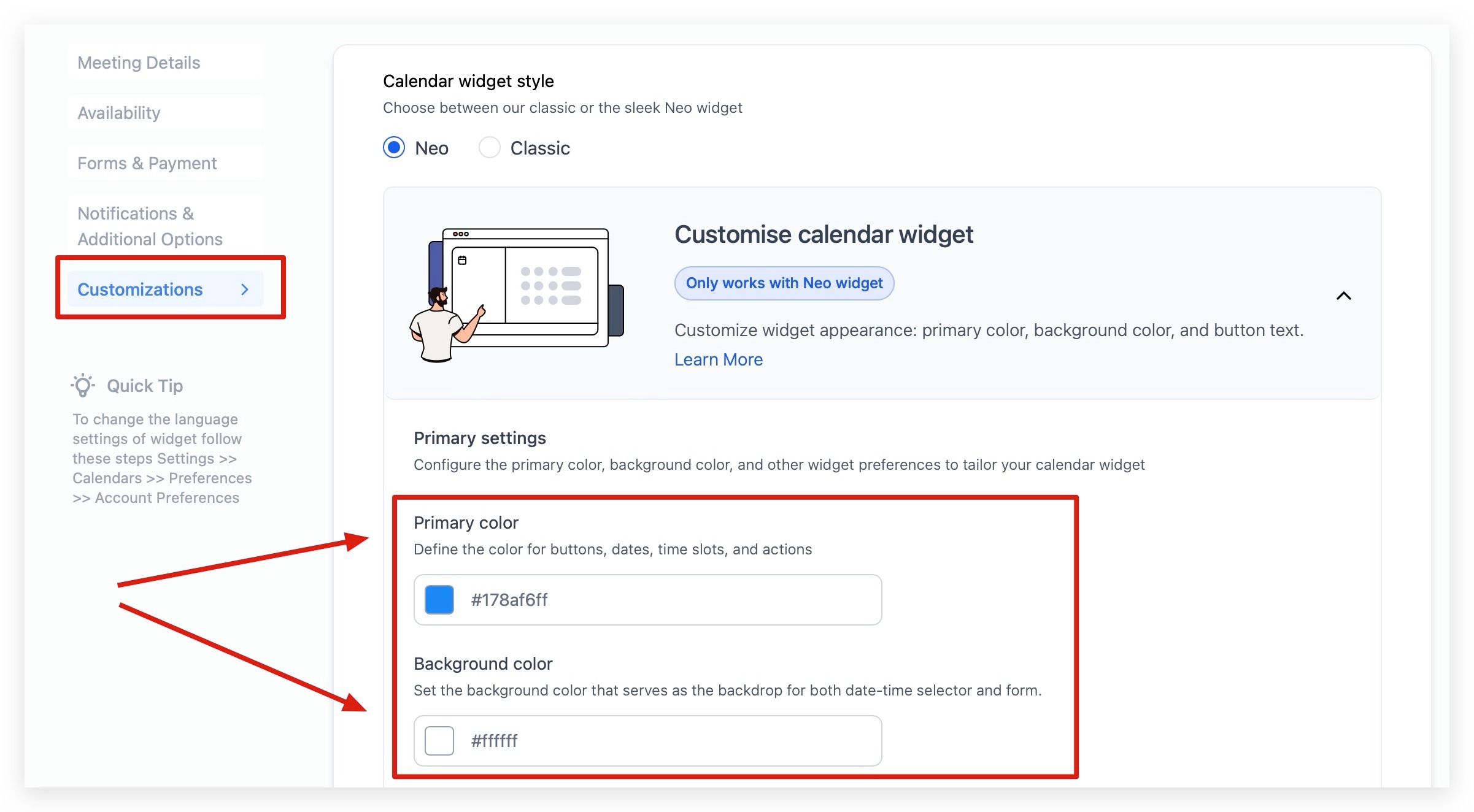 Once you're in the "CUSTOMIZATIONS" tab, scroll down until you see the color pickers. You will see 2 options to change colors in your calendar, Primary Color and Background Color. Within these 2 options, you can adjust your calendar colors using HEXA codes or by sliding the picker around on the color selector.