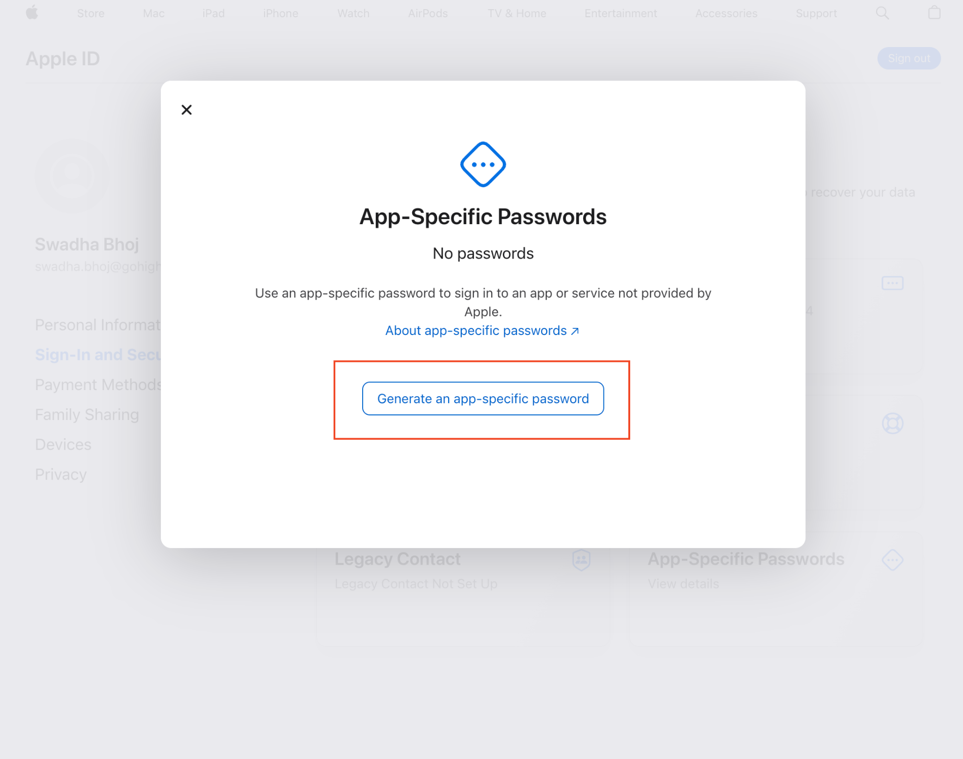 Click into the Sign-in and Security section and choose "App-Specific Password" then in the modal click "Generate an app-specific password".