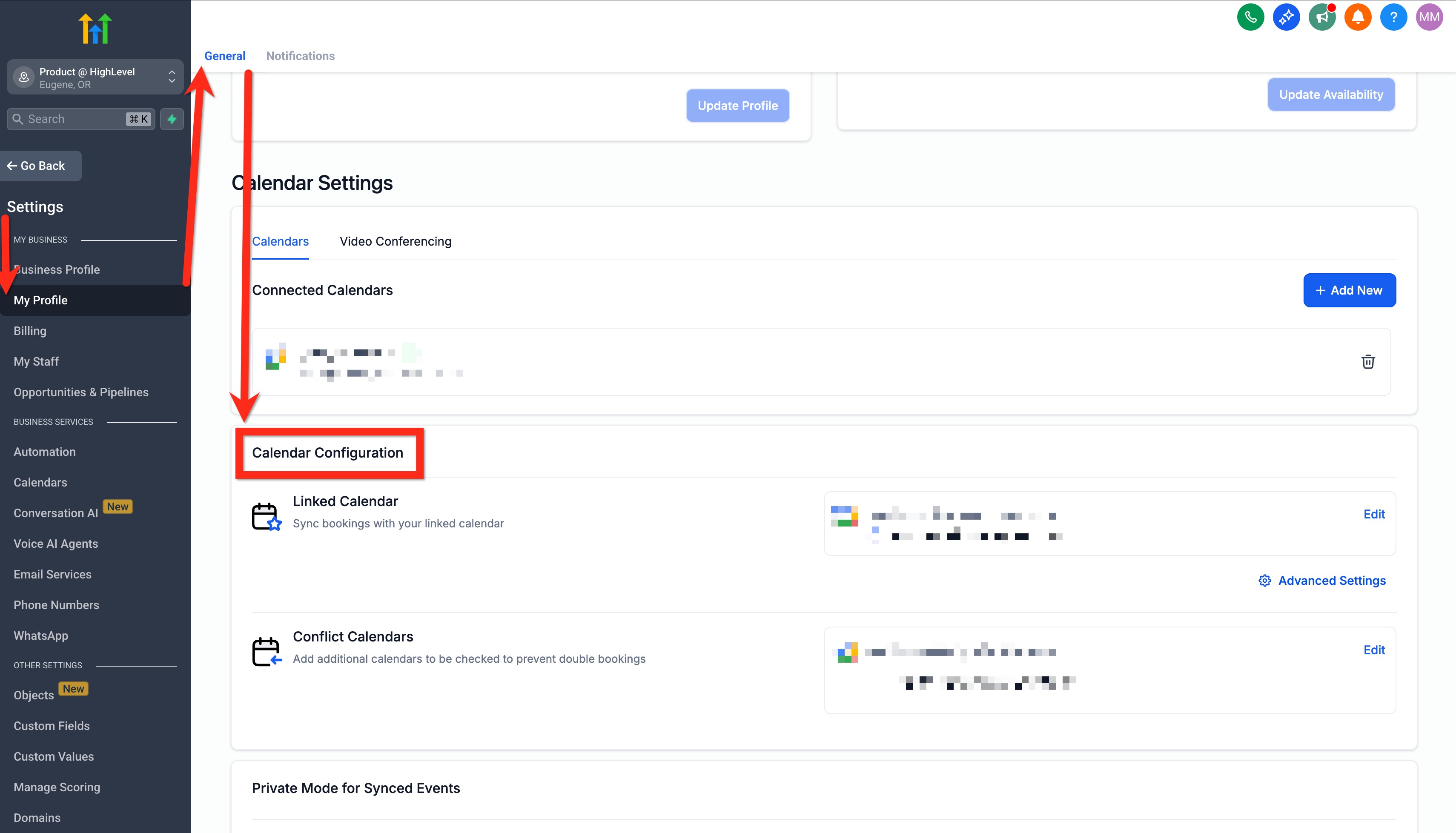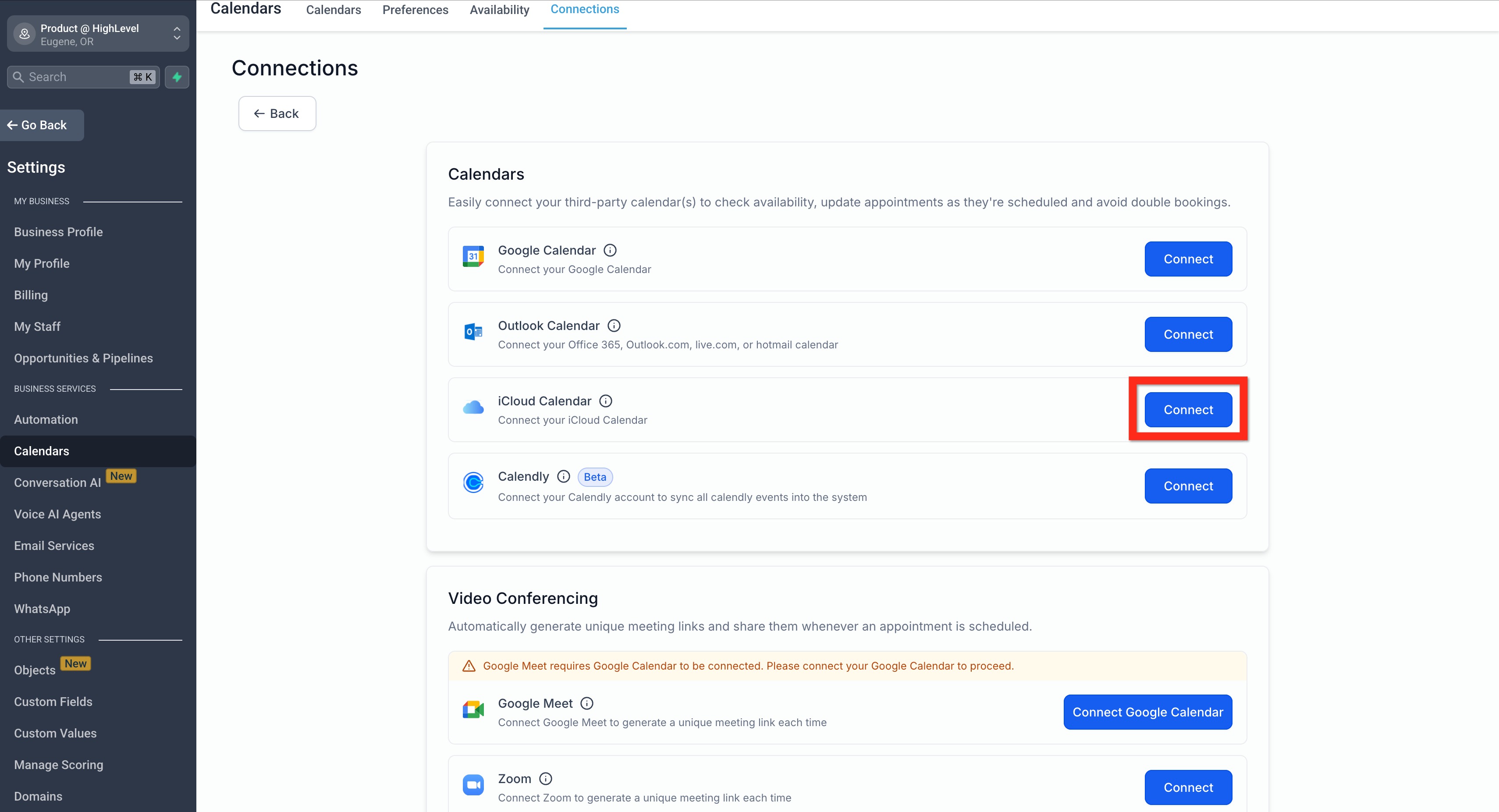Ensure Conflict Calendars are configured if you want busy times in iCloud to prevent double bookings in HighLevel.