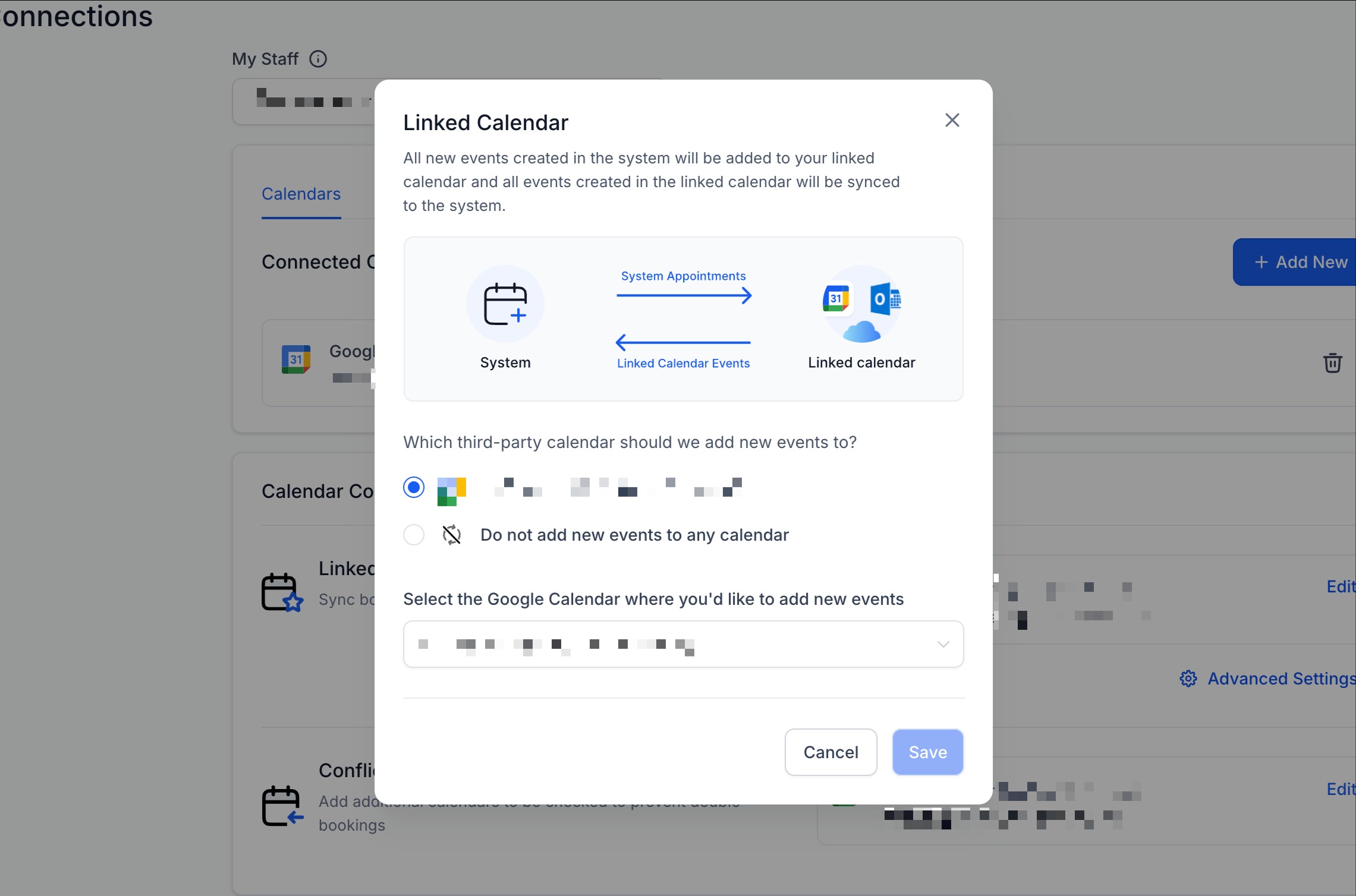 Click "Edit" next to the primary linked calendar. On the linked calendar modal, select the 3rd-party calendar to add new events to. All new events created in the system will be added to your linked calendar and all events created in the linked calendar will be synced to the system.