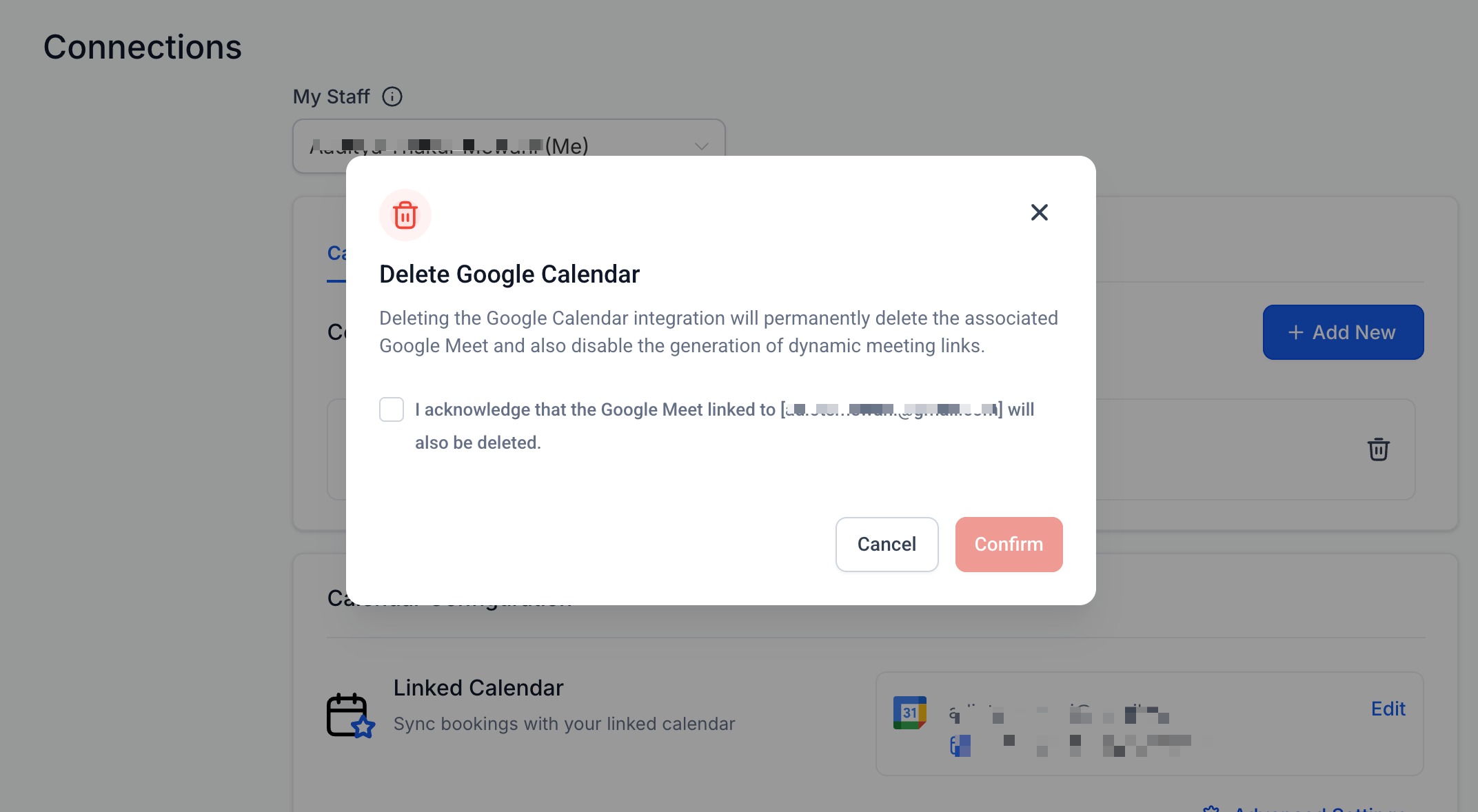 Navigate to Settings and Calendars and select the Connections tab. Under Connected Calendars, click on the Bin/Delete icon of the connected Google Account.