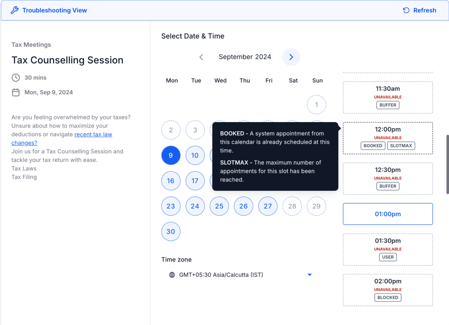 The Troubleshooting Tool is designed to help users identify why specific calendar slots are unavailable in the booking widget. By providing detailed insights into slot availability, users can easily understand the reasons behind unavailable slots and take corrective action if needed.
