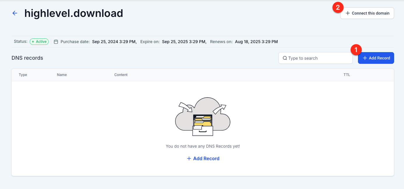 When you have purchased a domain in HighLevel (not when connecting a domain from outside HighLevel) you can manage the DNS records directly inside HighLevel.