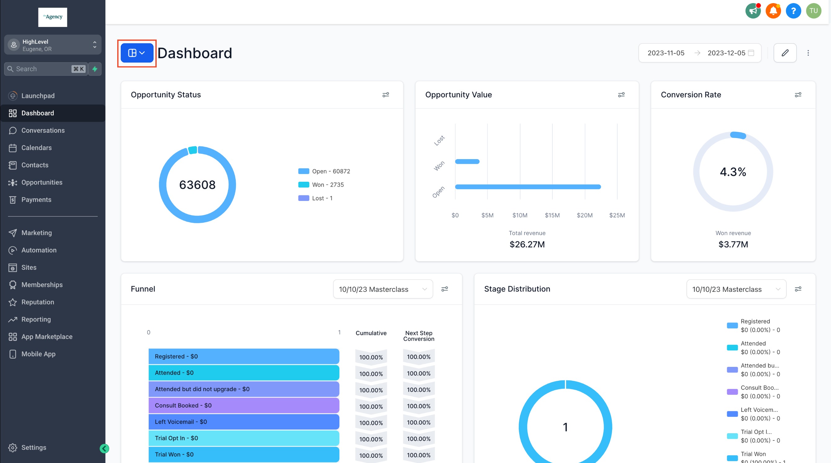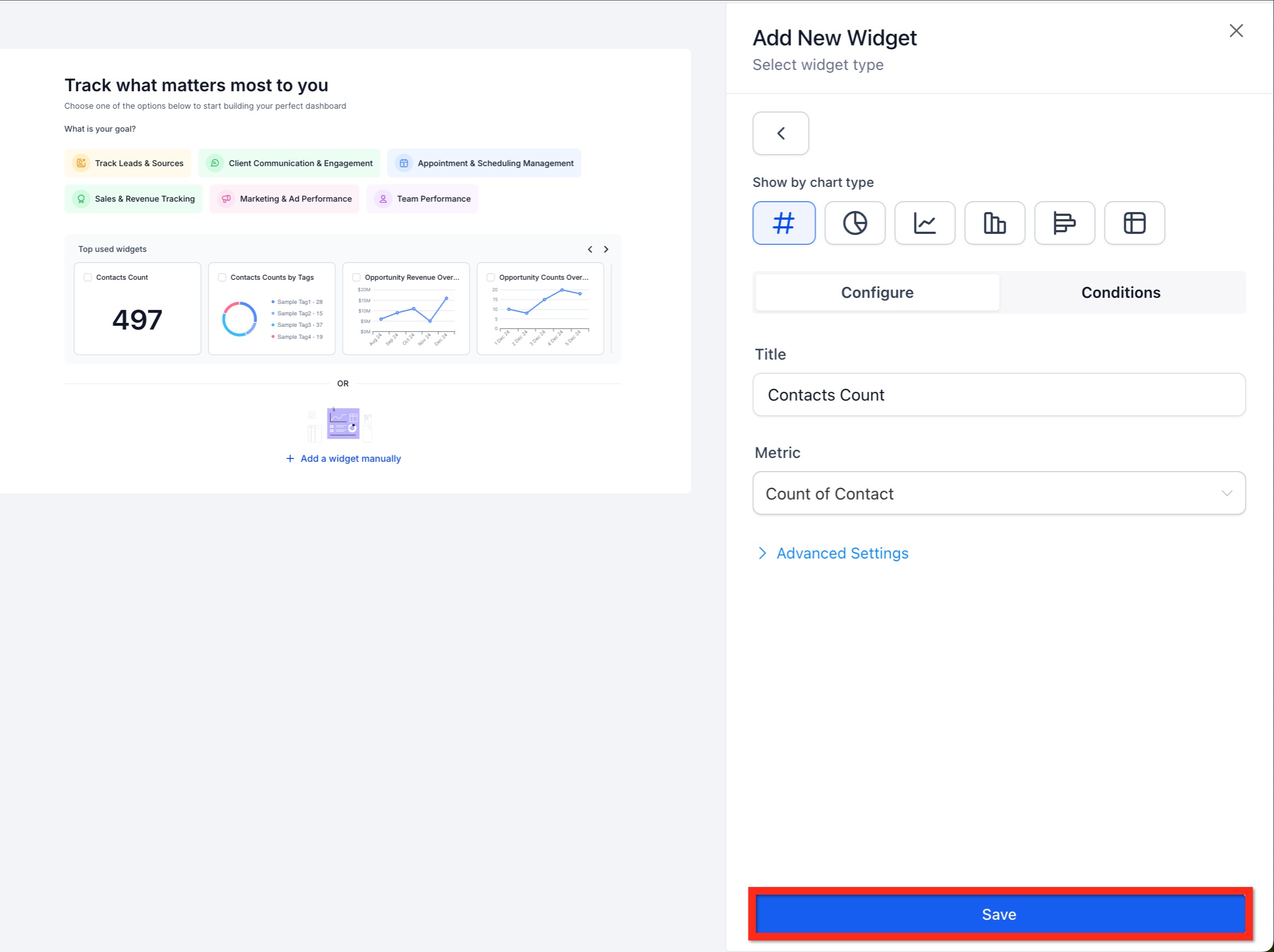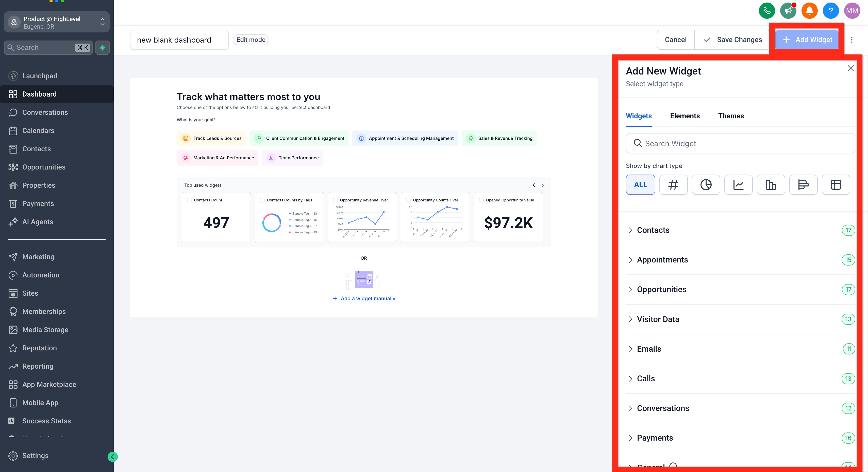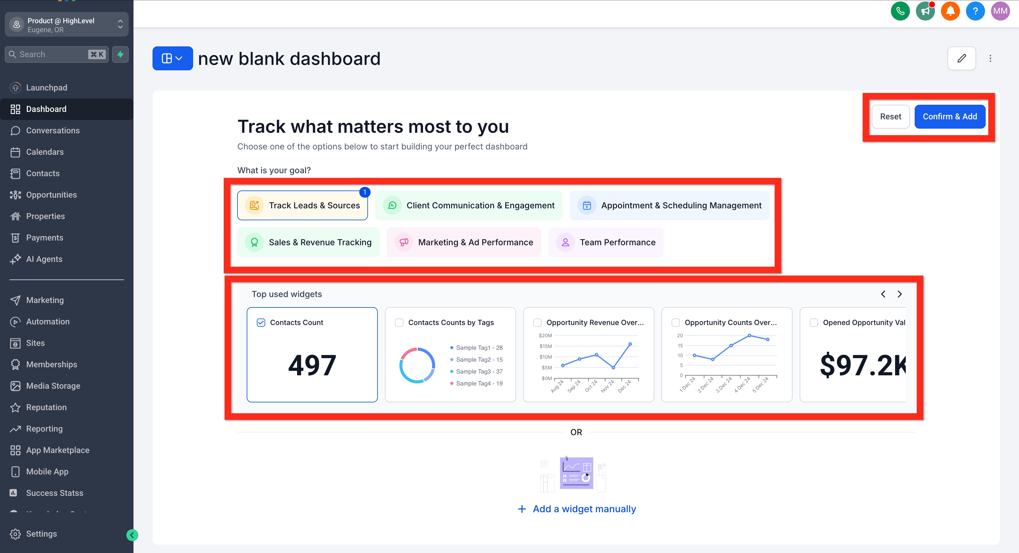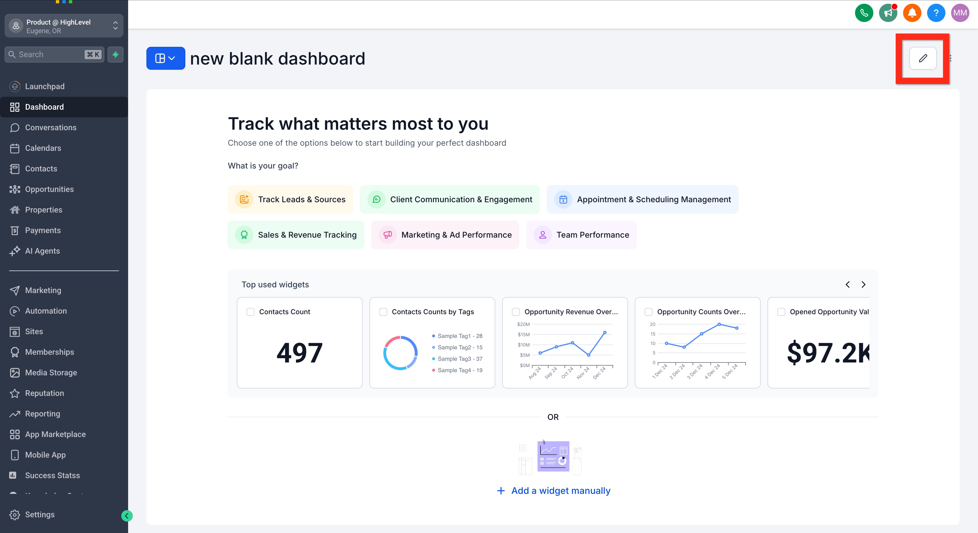 Custom Dashboards is a configurable analytics space in each sub‑account where you can track KPIs from contacts, appointments, opportunities, calls, revenue, and more. You control the layout, the widgets you add, the metrics they use, and even the dashboard’s look and automated report delivery.