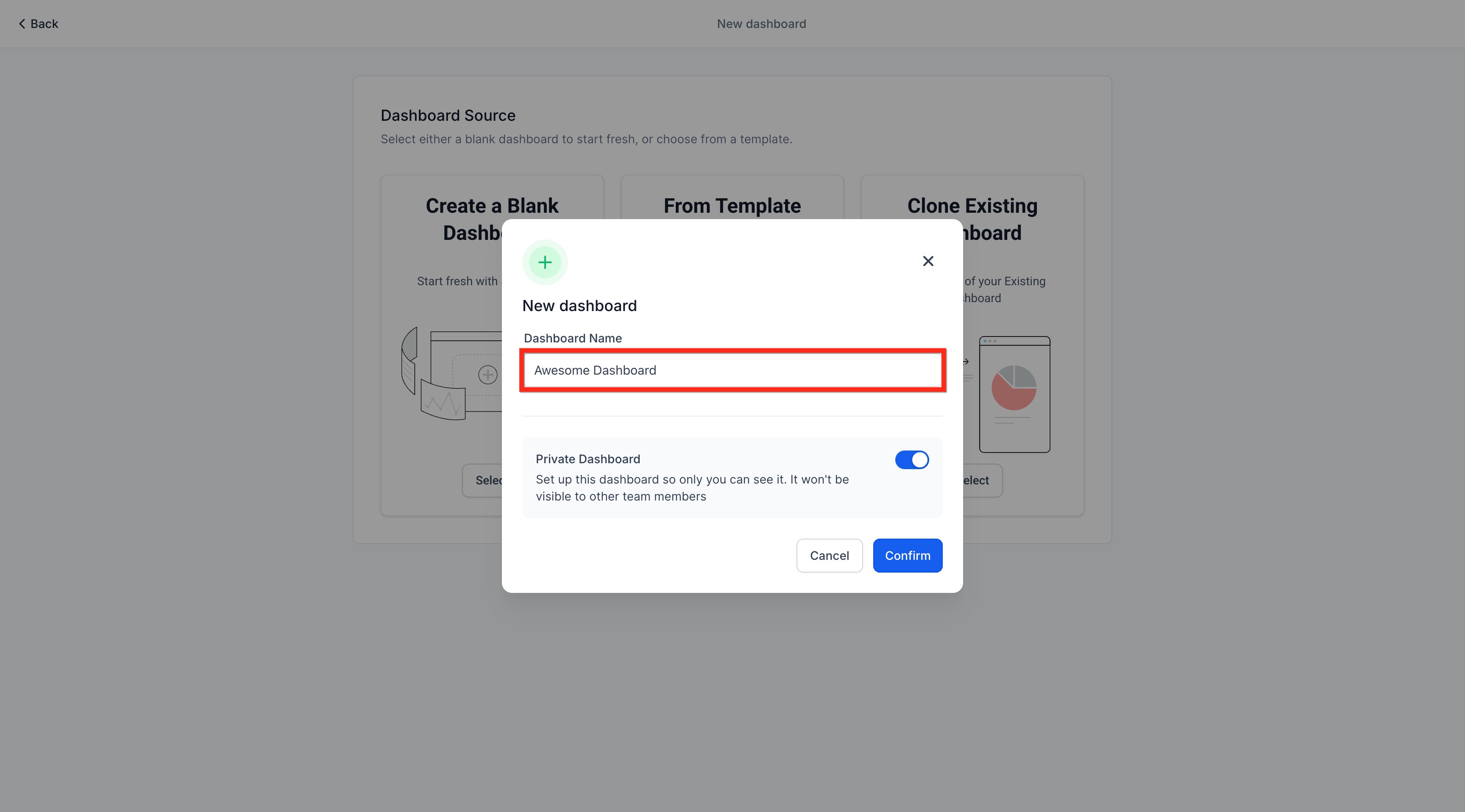 Click the "Confirm" button to finalize creation. This will open your new blank dashboard.