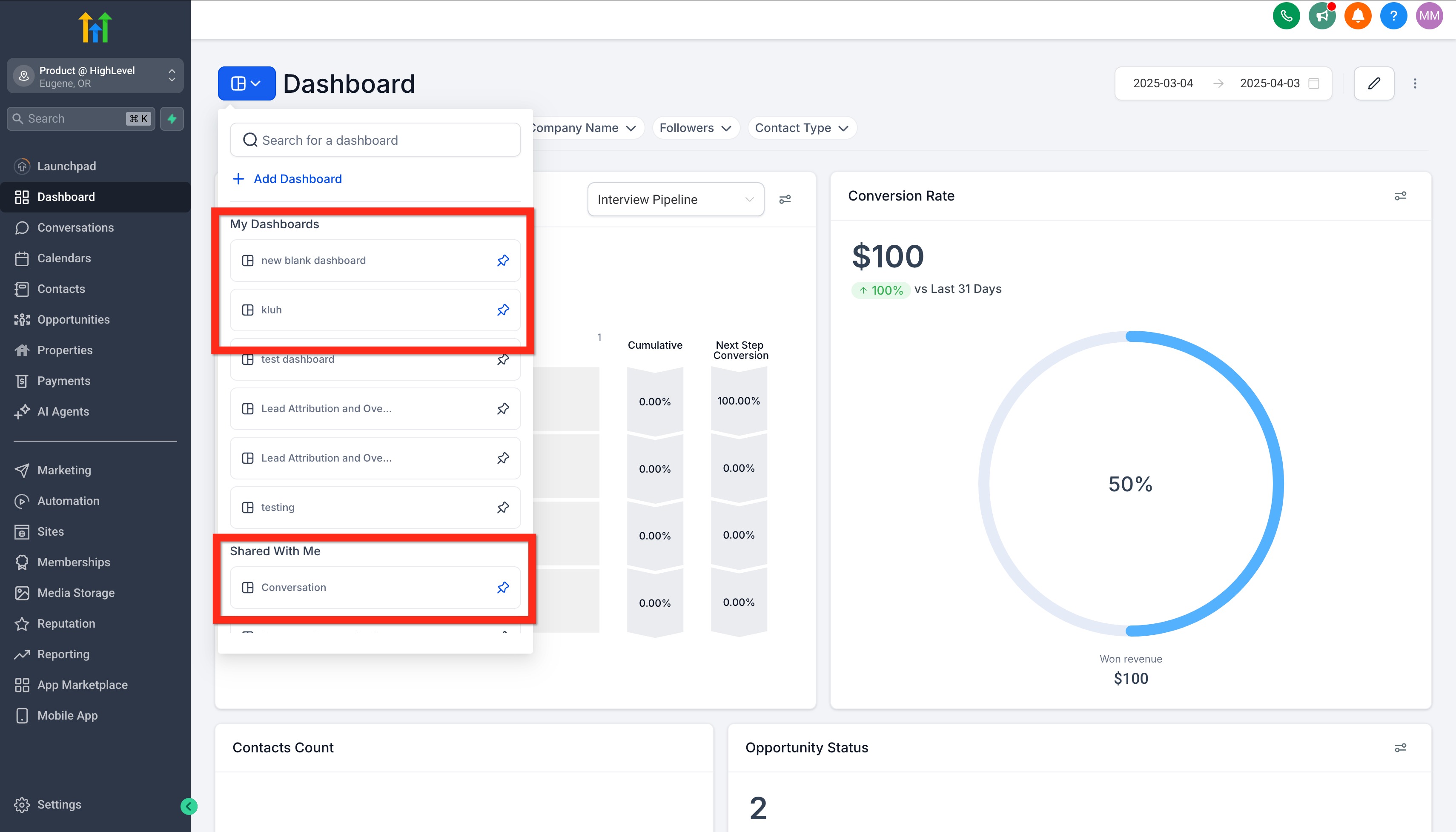Navigate to Subaccount > Dashboard and click on the dashboard selection menu.