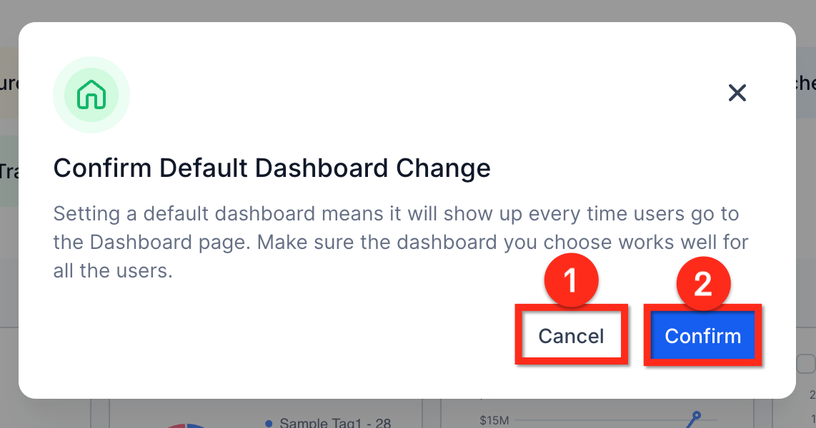 2. Confirm Button - Blue "Confirm". Click to change this to the default dashboard.