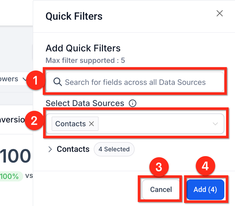 4. Add Button - Blue "Add" (quick filter count). Click to close the Add Quick Filters side panel and return to the Quick Filters side panel with changes.
