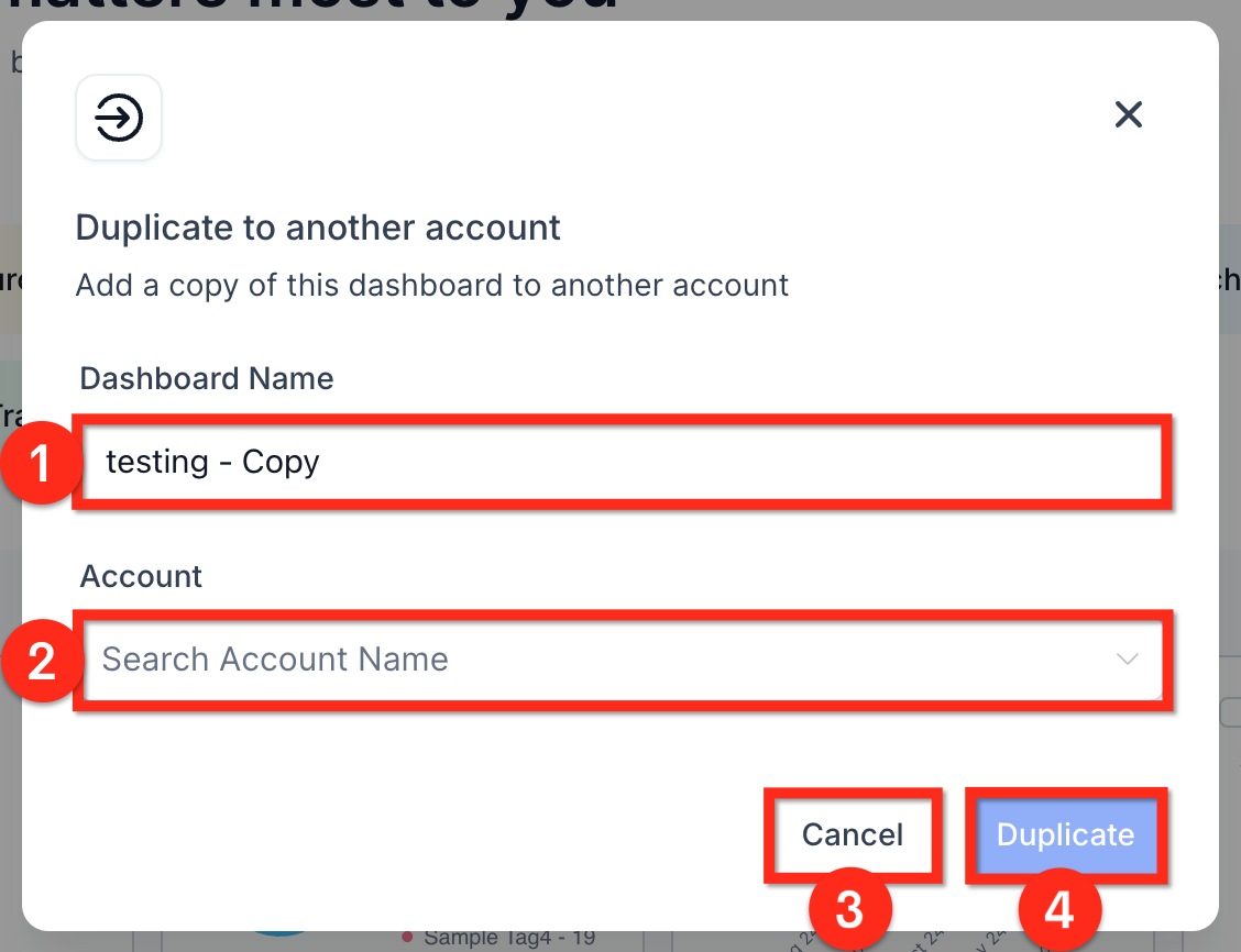 4. Duplicate Button - Blue "Duplicate". Click to create the new dashboard in the other account.