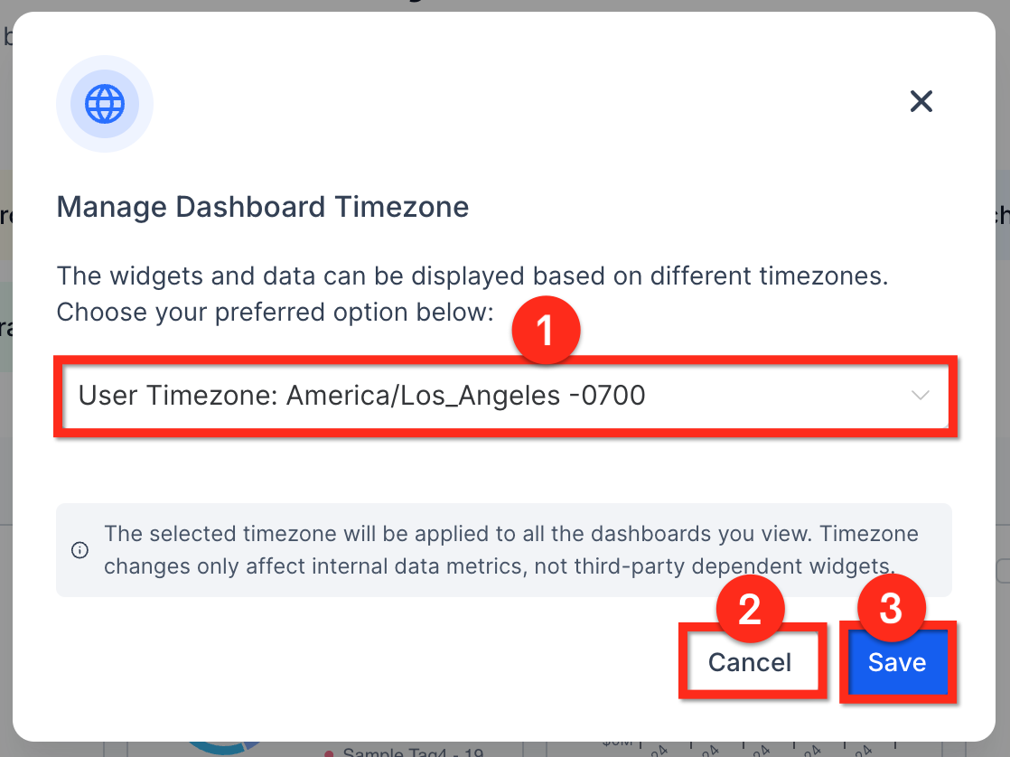 5. Manage Dashboard Timezone Button - Looks like "Manage dashboard timezone". Click to open the manage dashboard timezone modal.