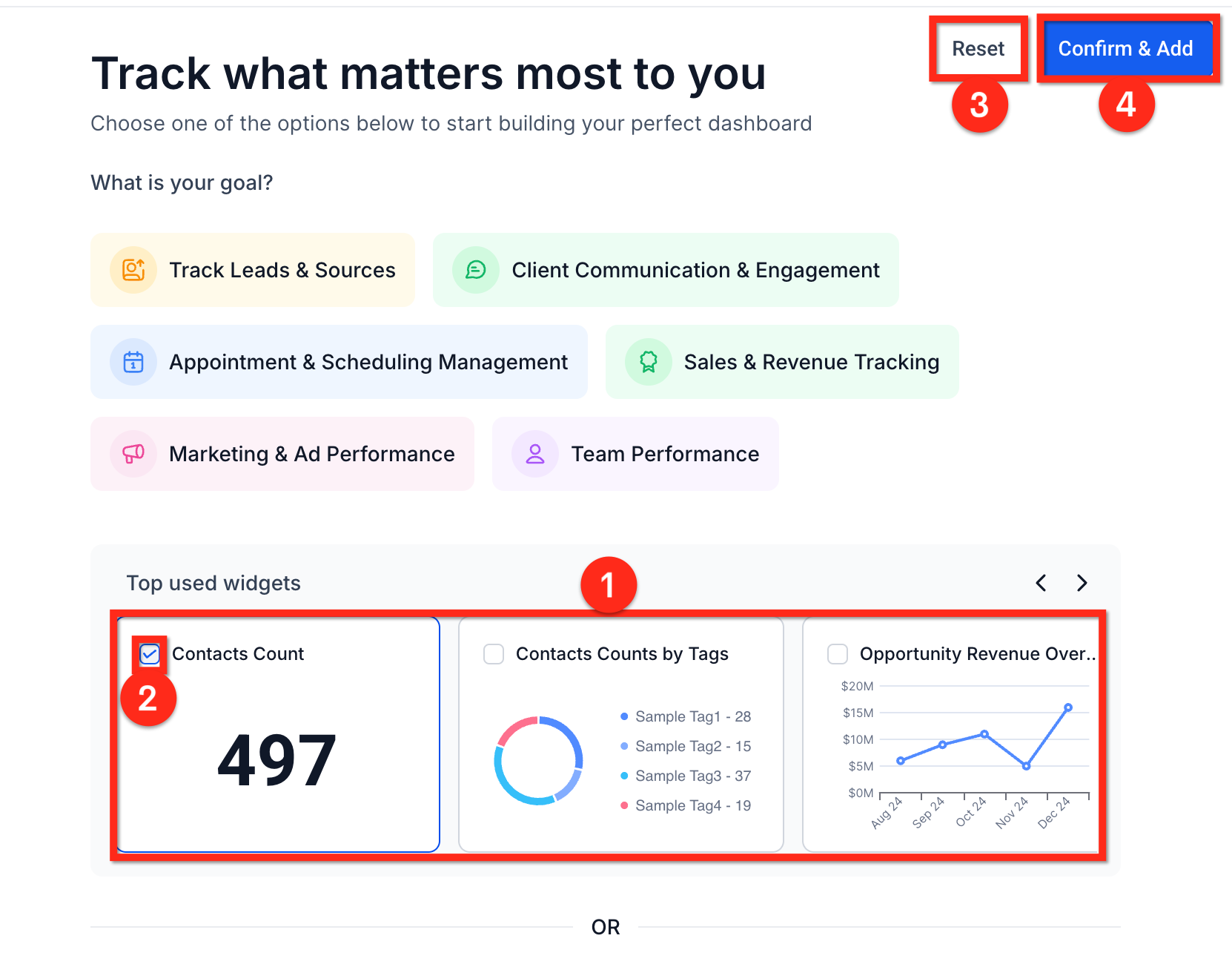 3. Reset Selection Button - "Reset Selection" Click to deselect all the widget card checkboxes.