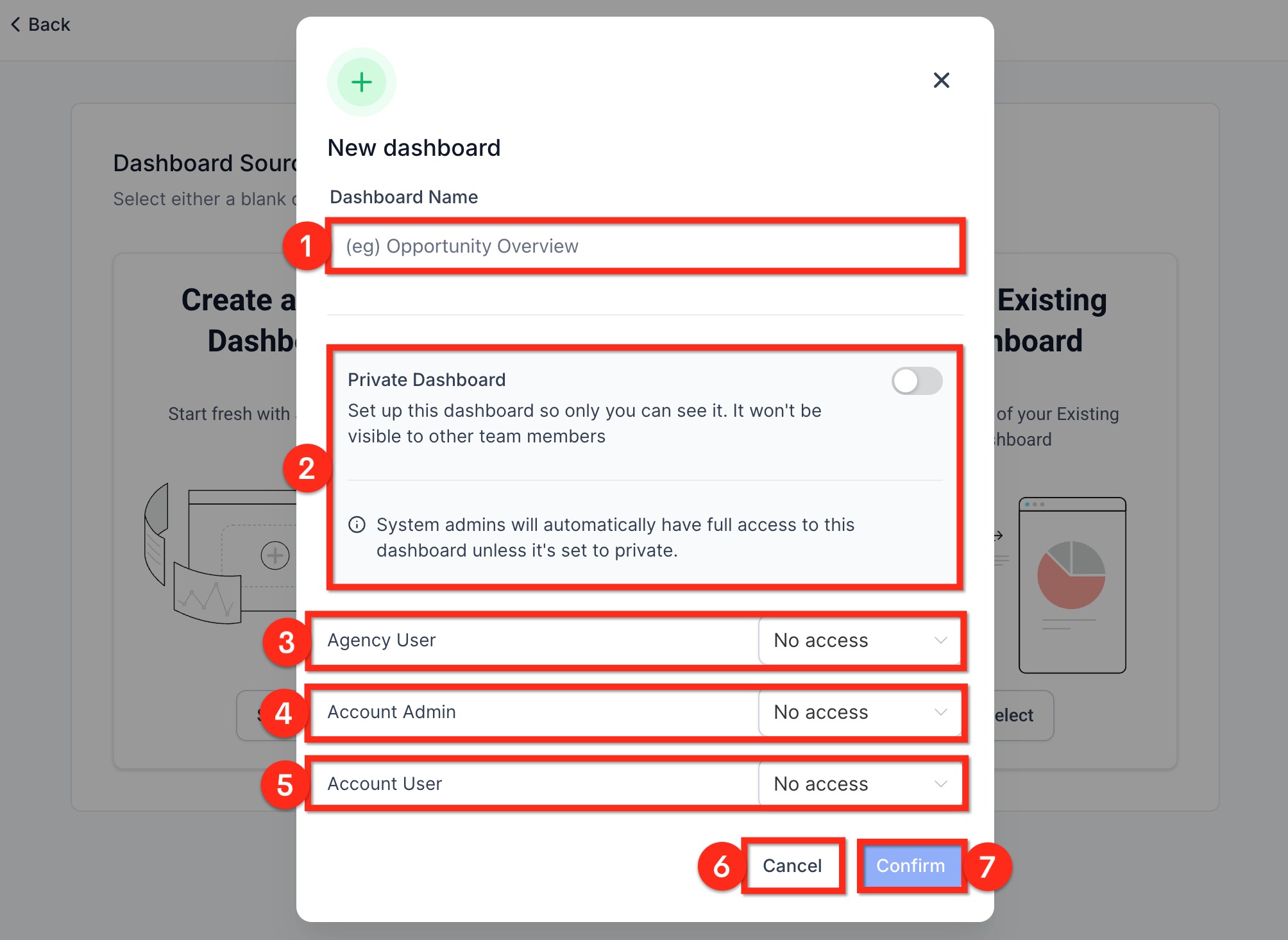 7. Confirm Button - Looks like a blue button labeled "Confirm". Click to create and open the new dashboard.