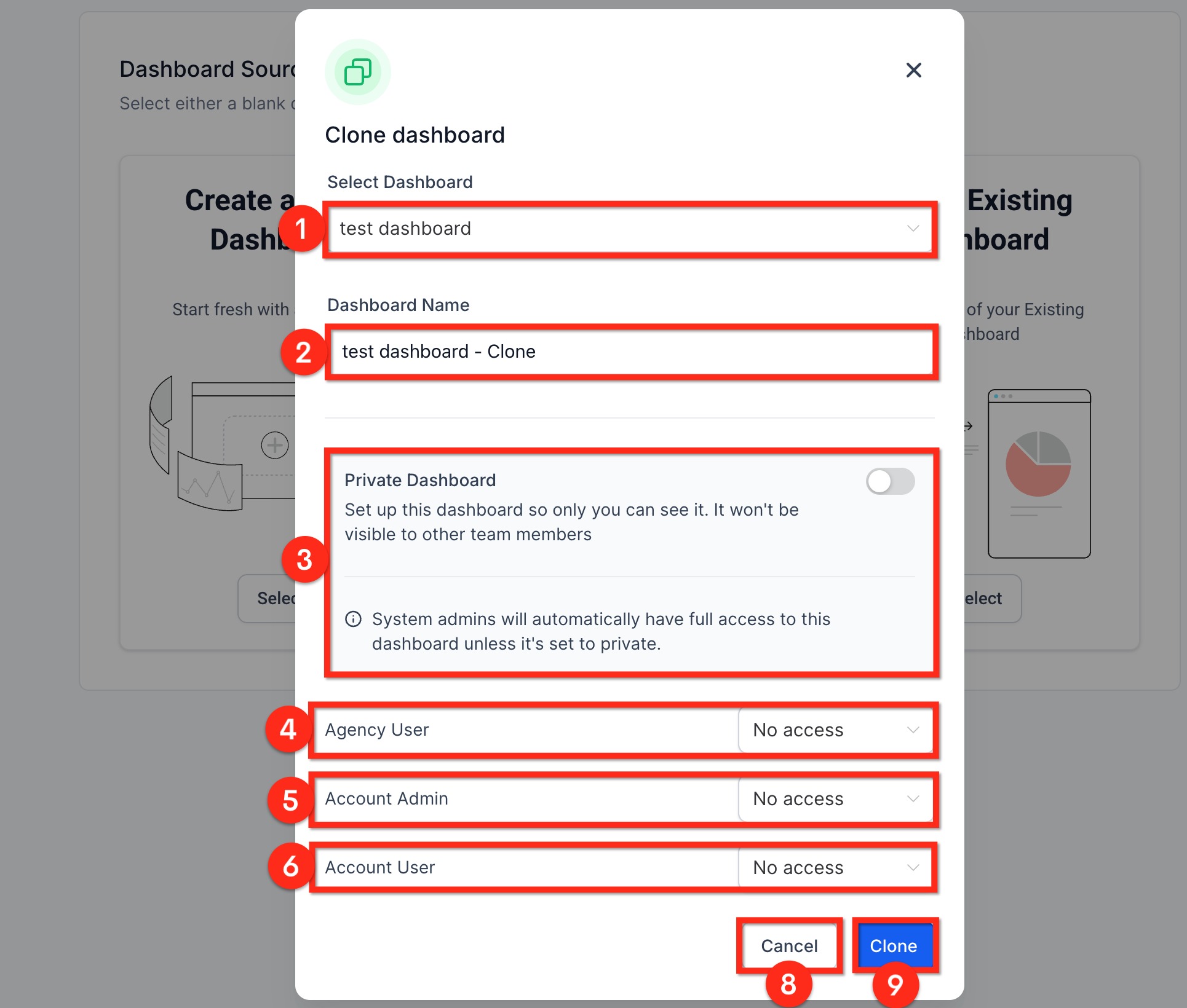 2. Dashboard Name Field (New) - Looks like a text field with the selected dashboard name and " - clone". Edit to set the new dashboard name.
