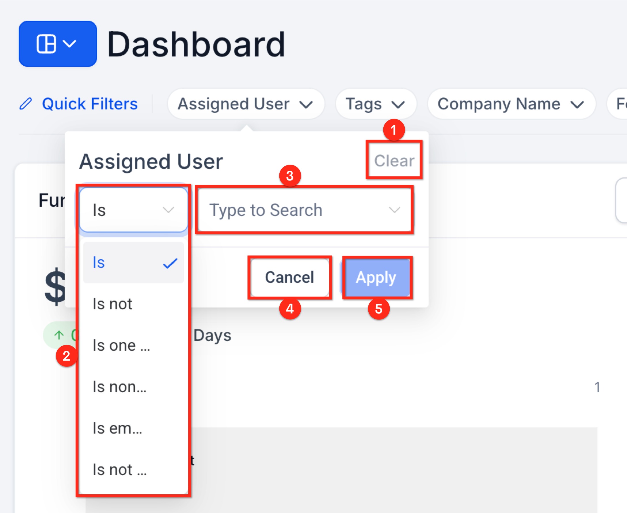 • "Is" - Click to set quick pill to [data source] IS [one or more data].