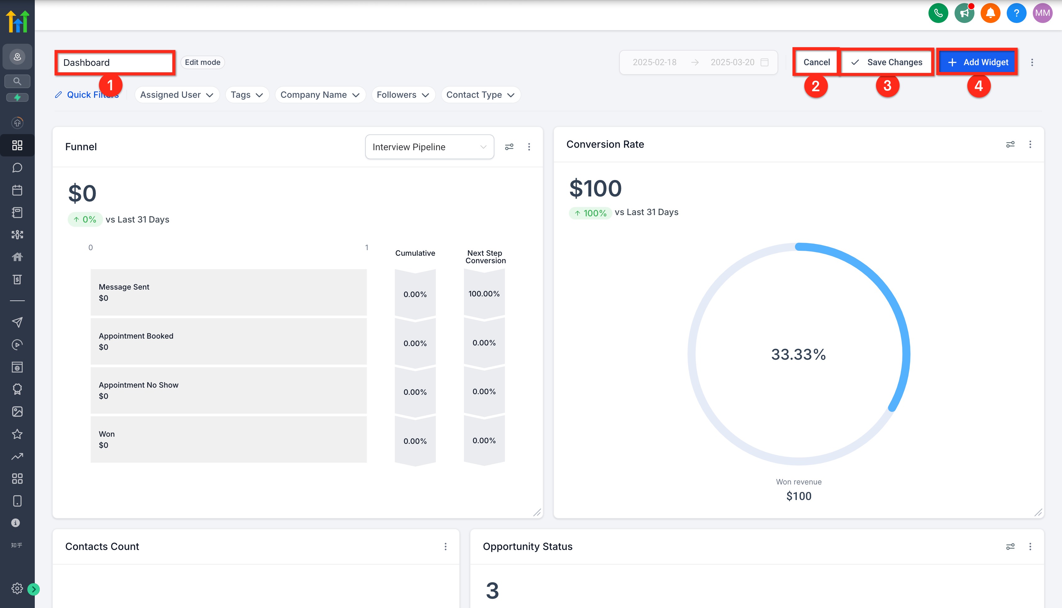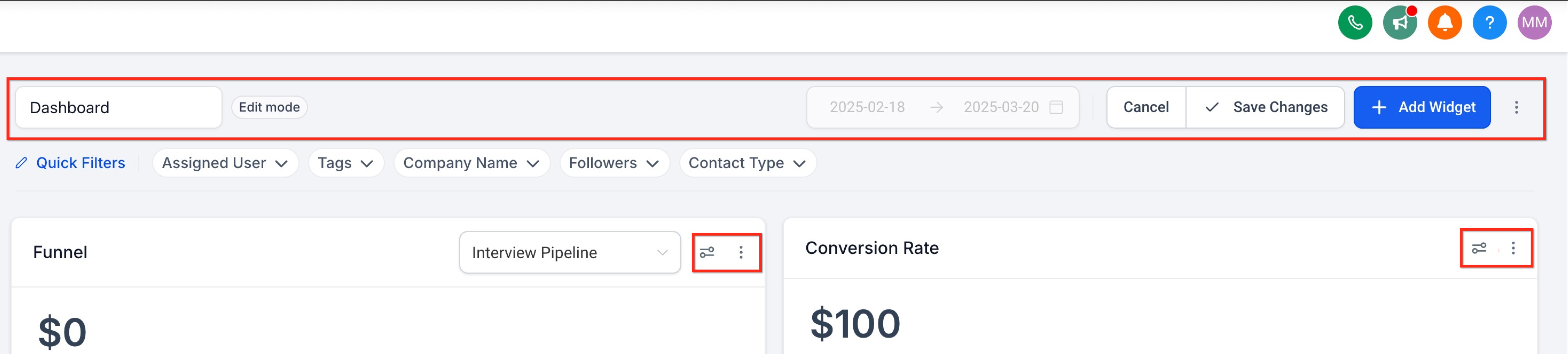 • View Mode - Looks like a list of widgets with filters. The normal state of a dashboard where you change some dates and filters and learn about activity in the subaccount.