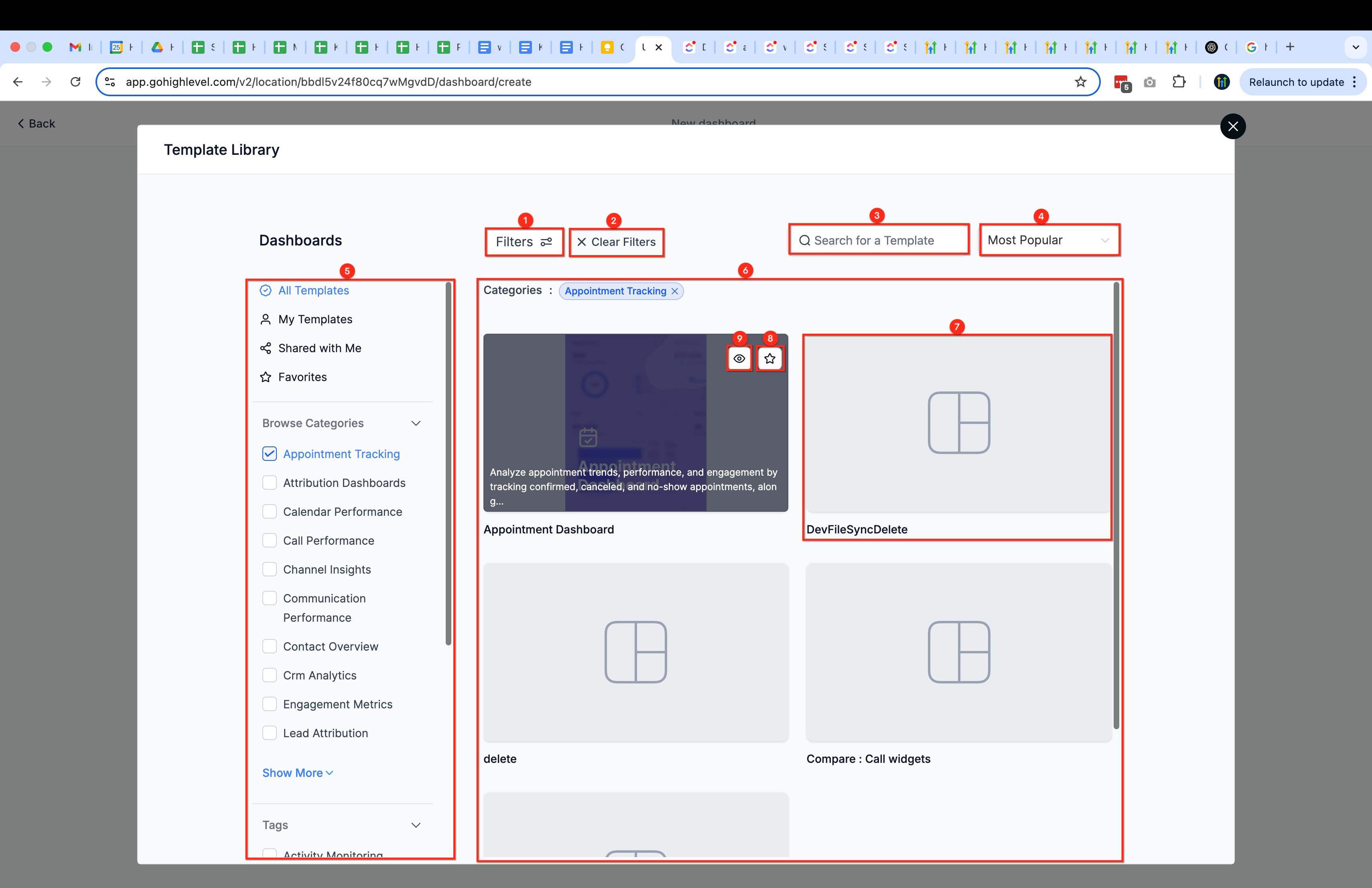 1. Search Field - "Search for a dashboard"Type to filter dashboards.