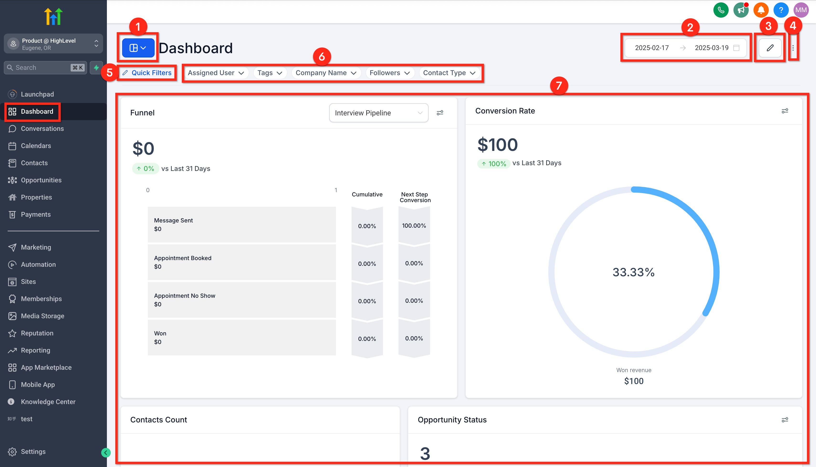 1. Dashboard Selection Menu - A blue button with a panel icon and a down carrot. Click to expand the dashboard selection menu.