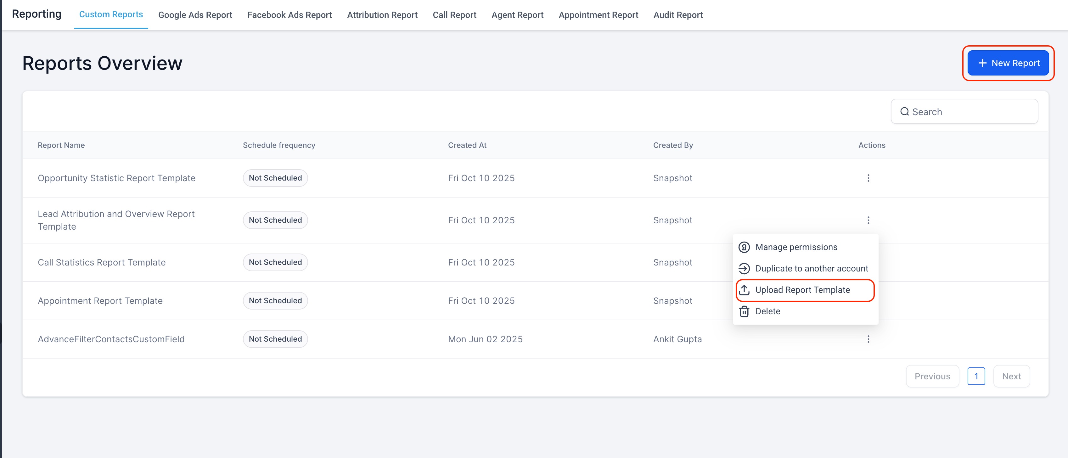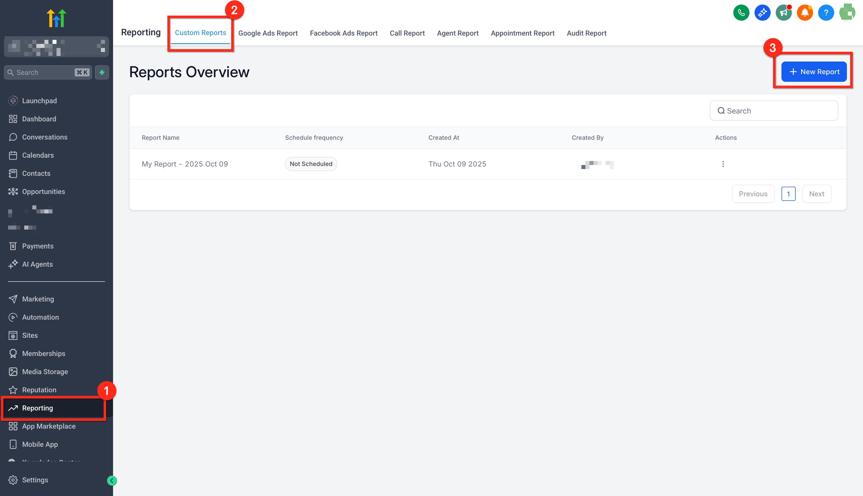 Navigate to Reporting: Open the target sub‑account and go to Reporting › Custom Reports and Click New Report: Start a new report from the standard creation modal.